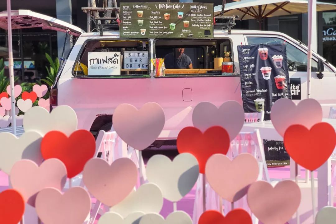 不同于Emporium and Emquartier炽热的正红,泰国曼谷Central Village购物中心以粉色为主题,在美食广场前搭建下午茶站点,情侣们不仅可以享受美食,还可以拍照打卡,共度甜蜜时光。