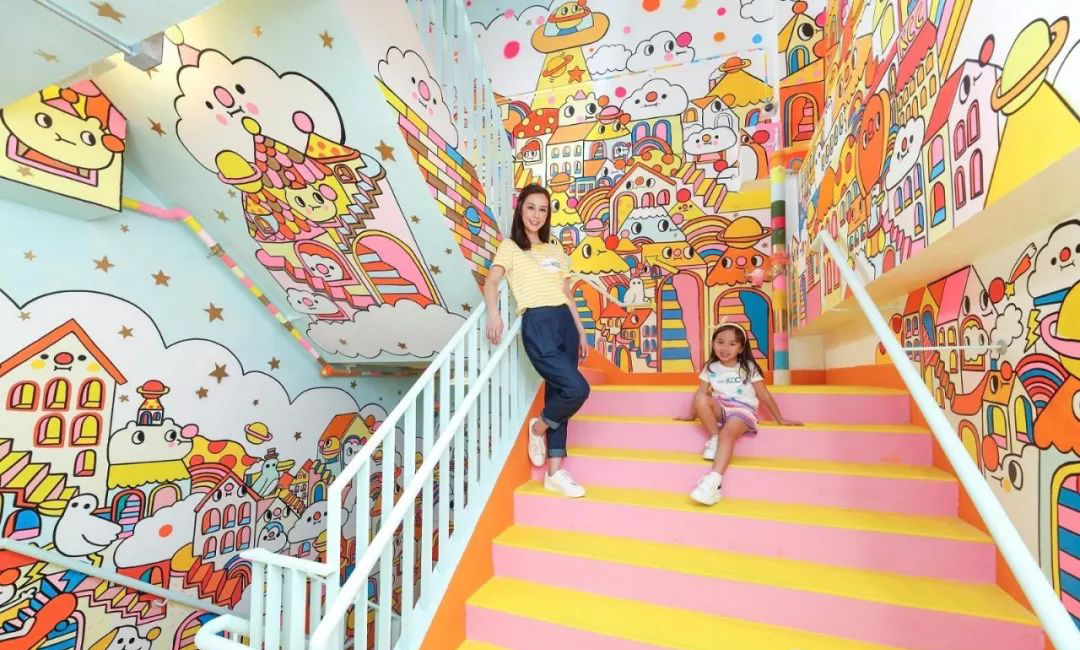 除了室内6大景点,Jane (Messy Desk)更善用商场是工厦前身的独特优势,亲手将连接商场及天空花园Green@KCC的多层楼梯绘画成全方位「星球云家族」世界,打造成3大特色主题楼梯。由地上的梯级引伸到天花板,每处都可以见到「星球云家族」的踪影,让寻梦者可以全身沉醉在万欢腾的「星球云家族」世界之中。