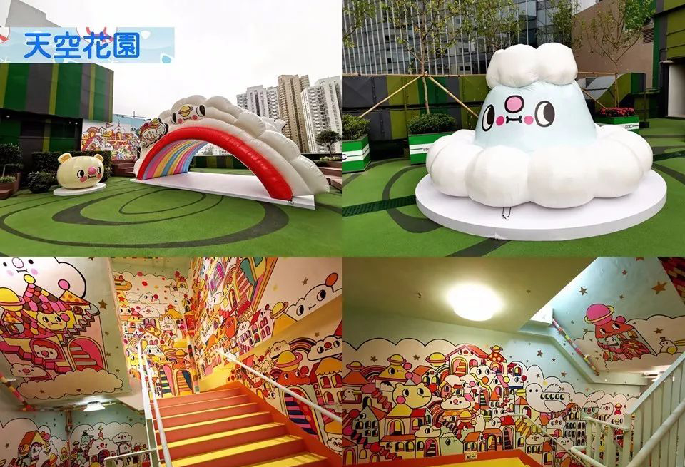 白云弟弟正站在joy@KCC 中庭向大家招手,迎接大家的莅临;各位更可以到life@KCC 3楼探访白云弟弟的故乡,参观「云先生之家」;「趣怪飞机雀」继续往上飞,到达由life@KCC 8楼至全新天空花园「Green@KCC」的「星球云家族」世界,楼梯每处都可见由Jane (Messy Desk)亲手绘画的「星球云家族」,每个角落都填满色彩,仔细看连天花板的水管也化身梦幻「彩虹管道」,让人沉醉;穿越「星球云家族」世界后,便抵达Green@KCC。天台上架起8米阔的云上彩虹隧道,各位可以牵着「泡泡富士山」及「寻梦人」一起由彩虹一端走到另一端,回想小时候的天真烂漫的愉快回忆!
