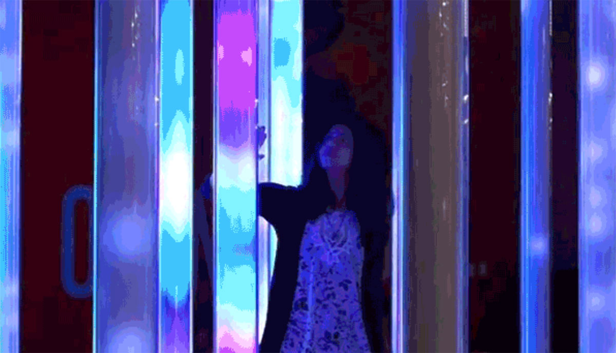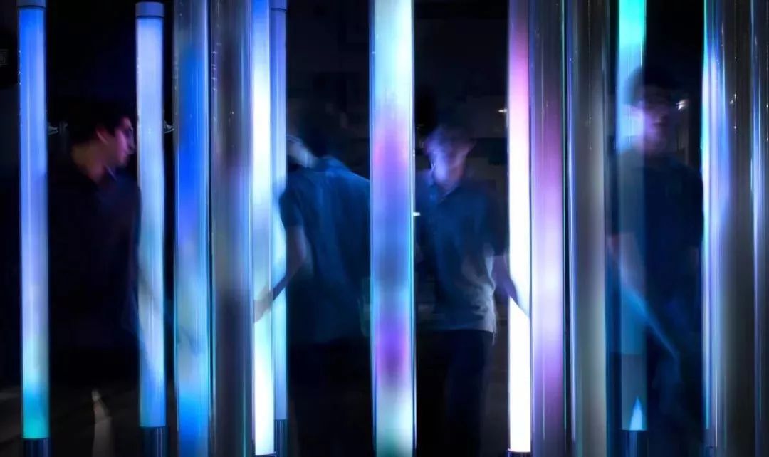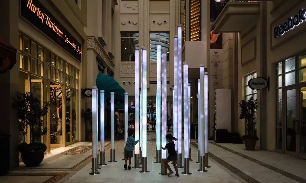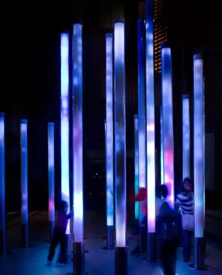 这是由数只螺旋状排列的玻璃灯管组成,通过灯光和声音效果来响应人的触摸。灯管里集合了各式各样种类繁多的鸟叫声,每一根灯管都大不相同。不同的接触方式会触发对应的声音。以缓慢的速度上下滑动,会产生和谐的动态混合效果,而更快速的滑动会引发一束光发射至顶端并转移至相邻灯柱,产生移动声源的错觉。