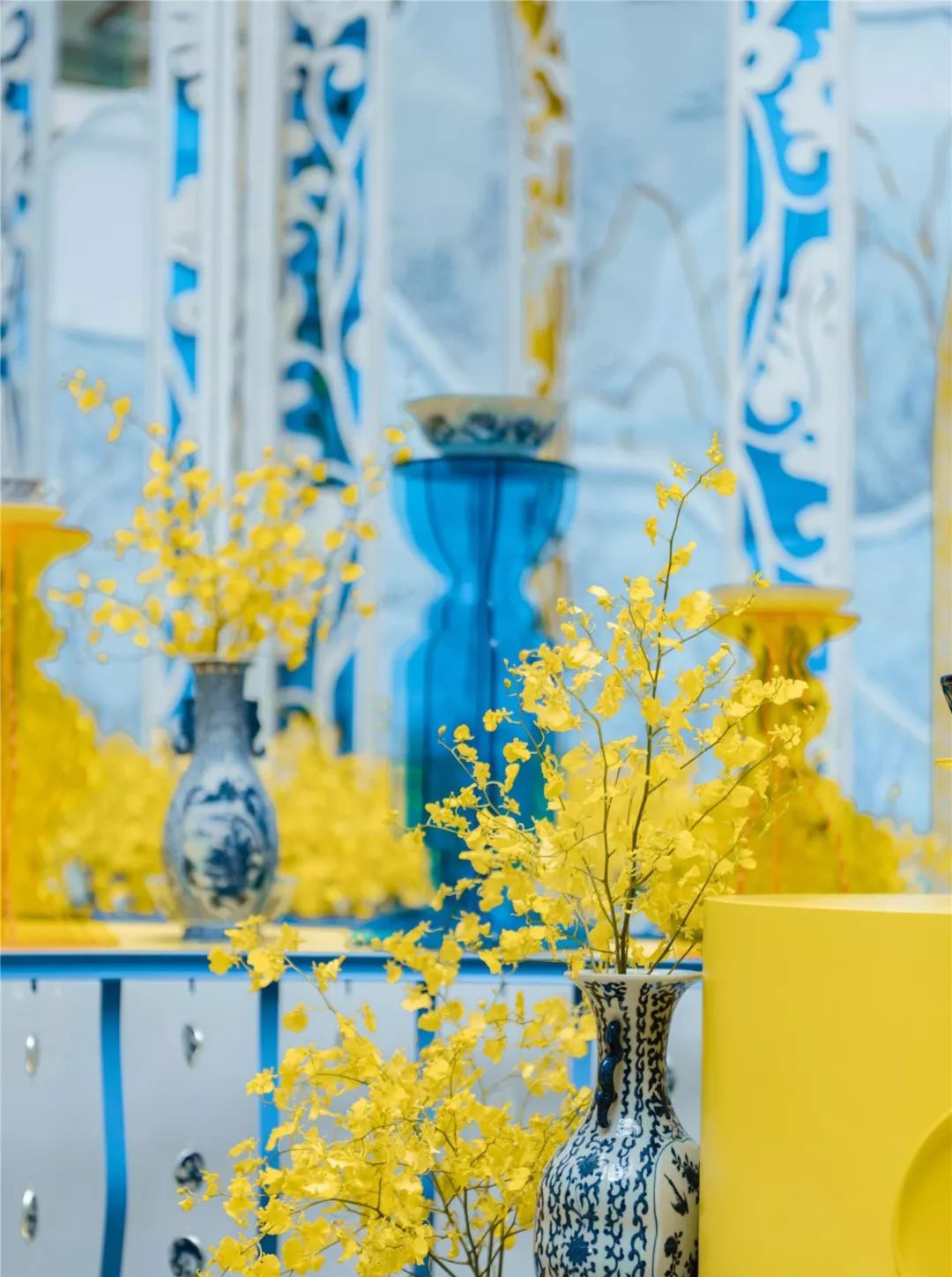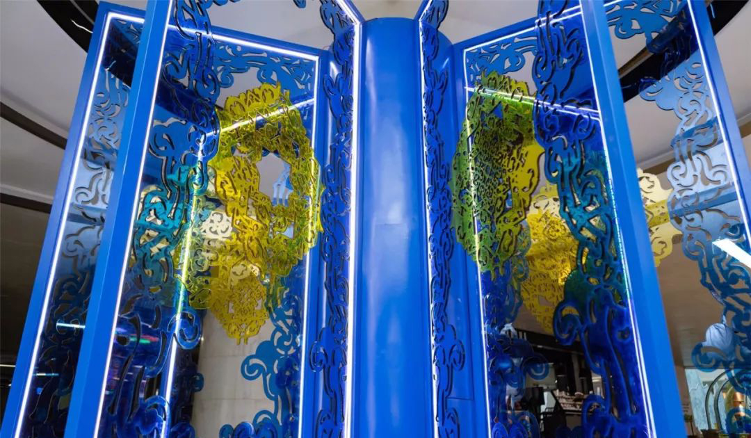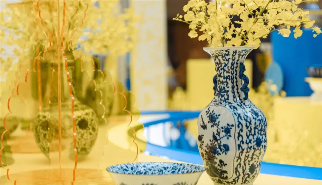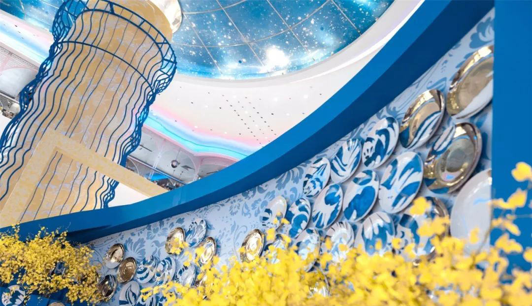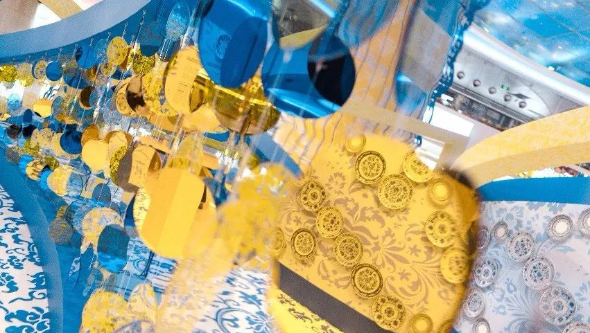 数千片印有青花瓷元素的装置随风雀跃,多重镜面反射将青花瓷的色彩映射出不一样的西式美,无论怎样看都实在美得令人窒息。