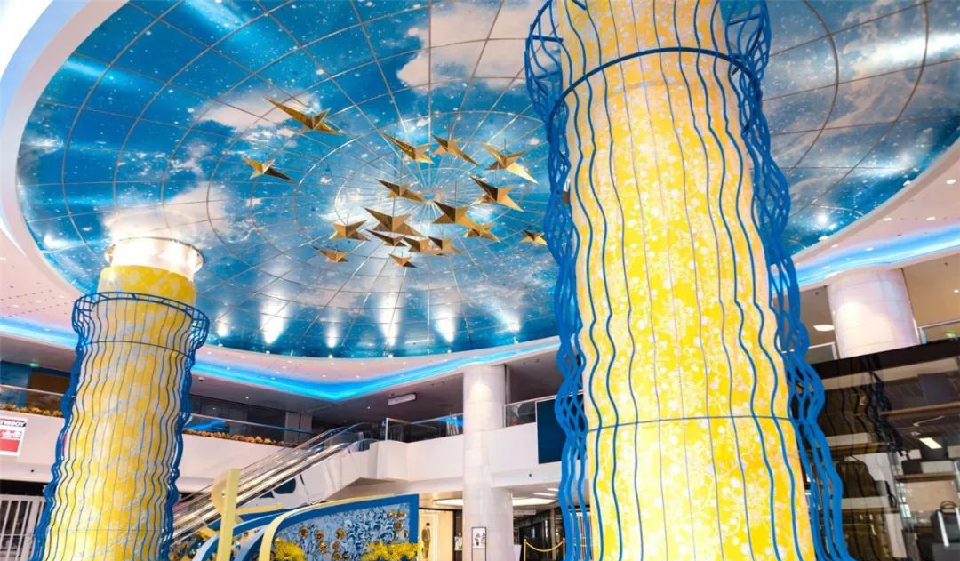 抬头望去高达6米的巨幅山水画映入眼帘,原来是中华传统刺绣工艺和团扇细软纱幔的匠心呈现。此刻传统与时尚在天河城中庭激情碰撞,犹如穿越时光遨游璀璨星空。