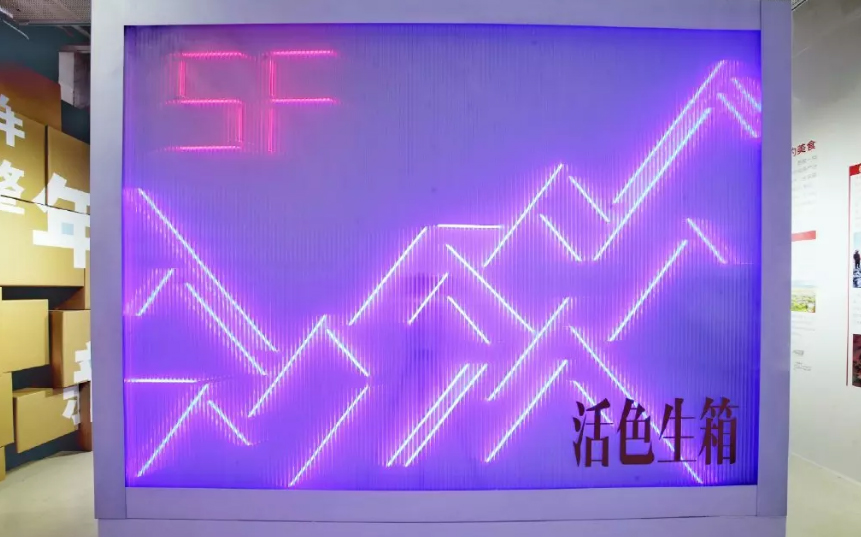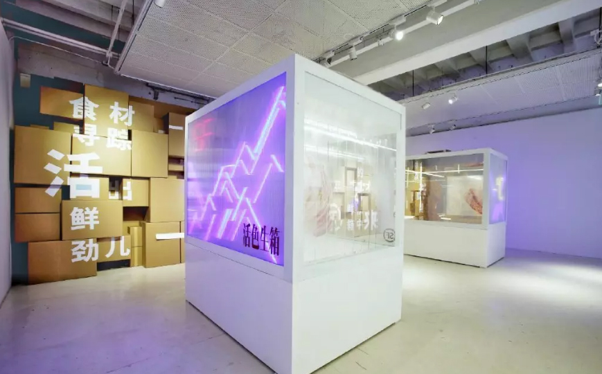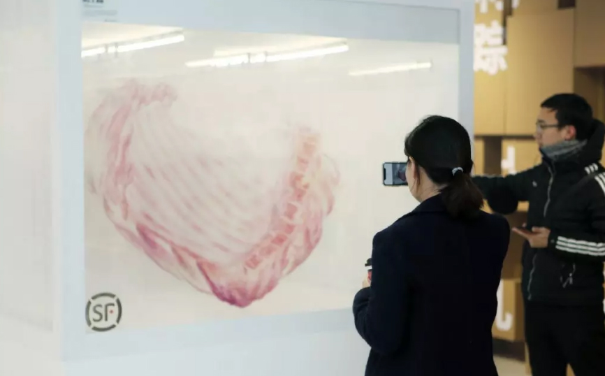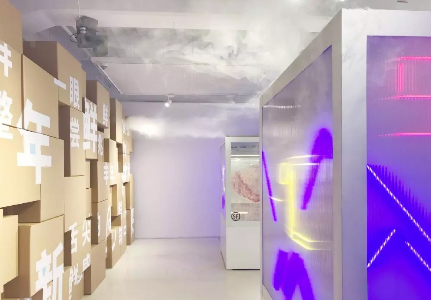 在顺丰整个生鲜冷链体系中,冷运车厢独具标志性,打开冷藏设备后雾气弥漫的瞬间也唤出了艺术家的灵感,这次展览我们便将三个艺术冷柜作为主角.冷柜的外观由情绪美术馆多次合作过的艺术家许倬尔进行创作。灯光装置为冷柜外层营造出科技未来感,蓝色光条组合成起伏山脉的图案,将翻山越岭的寻鲜之旅抽象化,留白给更多思考的空间。在许倬尔看来,光是生命的第四要素,让生鲜进入弥漫着光线的盒子里,寓意着它们的生命将在此得到延续。