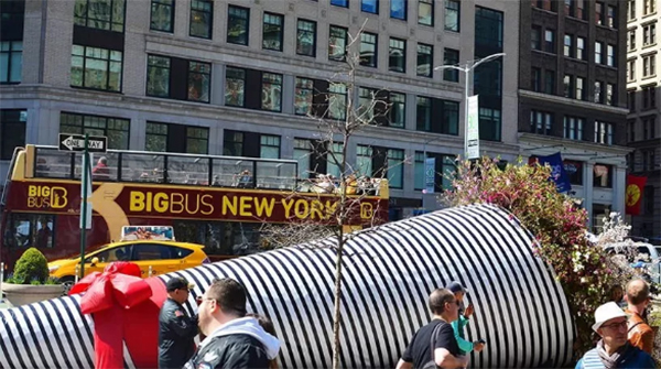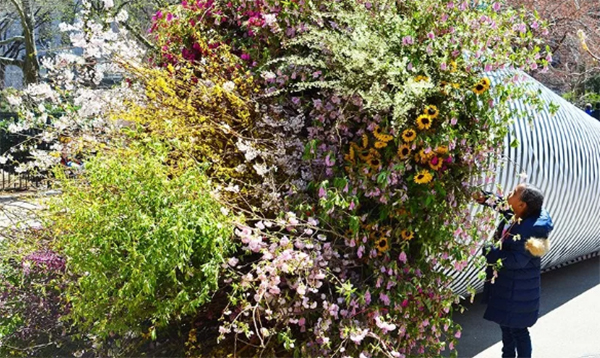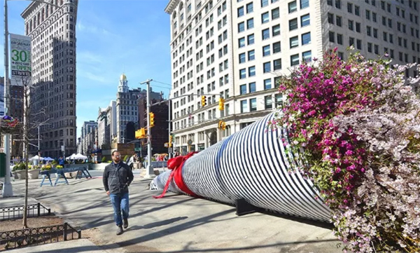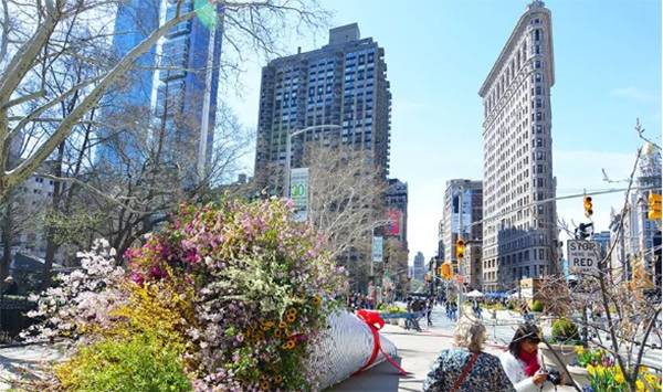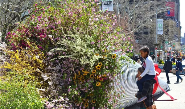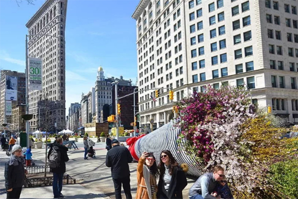 艺术家们通过捕捉典型的“纽约精神”,以一种近乎戏剧化的手法,塑造了一款城市尺度下,充满蓬勃生命力的“花艺装置艺术”。这件艺术品通过在世界上最繁忙的空间之一中展示一个拥有活力呼吸花园的无车未来的潜力来捕捉想象力。日常花束中的花材和叶材被树木和灌木取代。在这个“汽车”才是主角的热闹街道上,很快就变成一个公众热门的目的地。