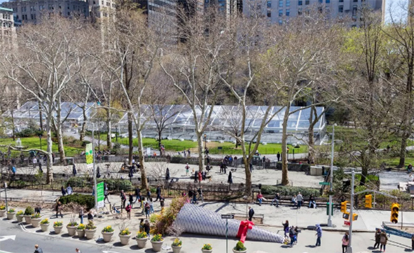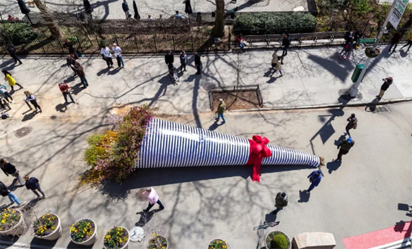 一幅40英尺长,8英尺高的临时公共艺术装置在曼哈顿熨斗区百老汇街24号的交叉路口展出。