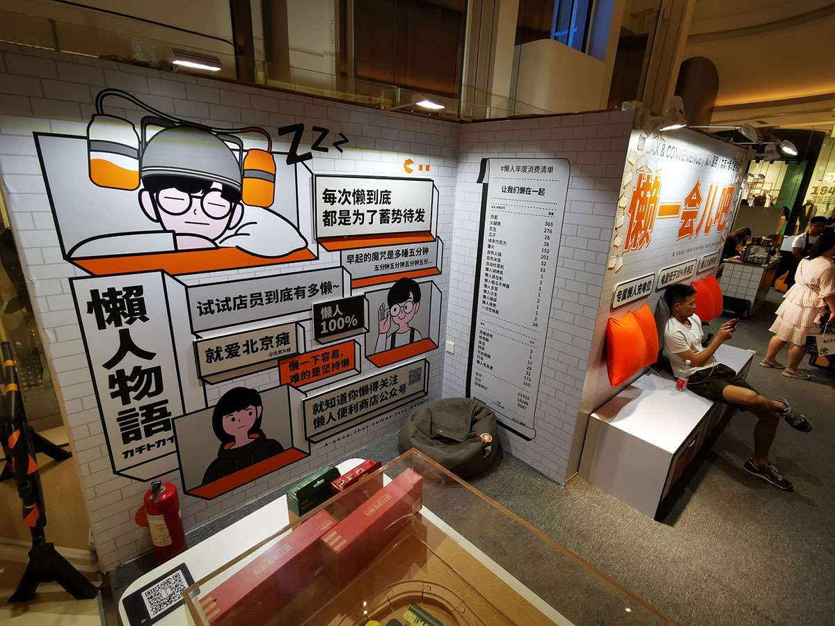 懒人便利店国贸快闪店内部空间,还有画面内容、懒人区域、互动体验等,整场面积有限,但是互动的机会却很多。在这里,你再也不用担心暴露出懒人属性会被嫌弃,相反,这里的一切都是为懒人生活提供便利的。当然也不会如此简单,后面还有更多的惊喜等你来撩,简直就是懒人们共同的心声啊。