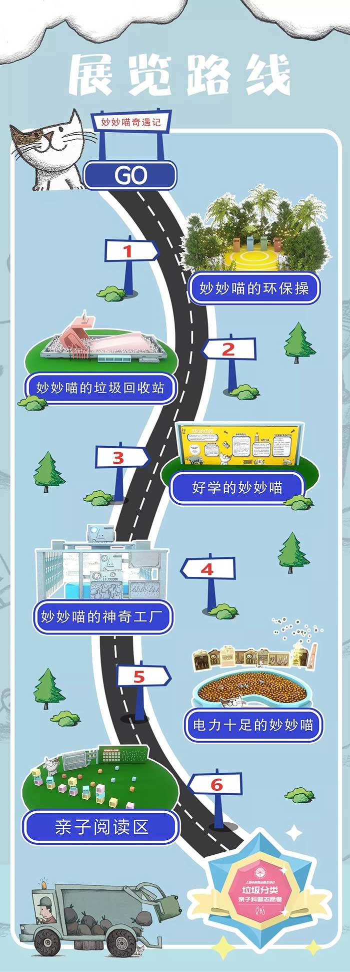 本次“妙妙喵奇遇记” 沉浸式绘本展,正是响应了上海市“垃圾分类 从娃娃抓起”的号召,获得上海市科普志愿者协会的官方认证和大力支持。协会还将为所有参观本次展览并完成任务的小朋友授予“垃圾分类小小科普志愿者”勋章,激励孩子们从我做起,参与全民环保。本次绘本展互动展区面积近1000㎡,以“环保,垃圾分类”为主题,将可回收垃圾、干垃圾、有害垃圾和湿垃圾等内容作为主要分区开展互动,打造了“好学的妙妙喵”“妙妙喵的神奇工厂”“妙妙喵的垃圾回收站”“电力十足的妙妙喵”“妙妙喵的环保操”五大不同类别的活动区。