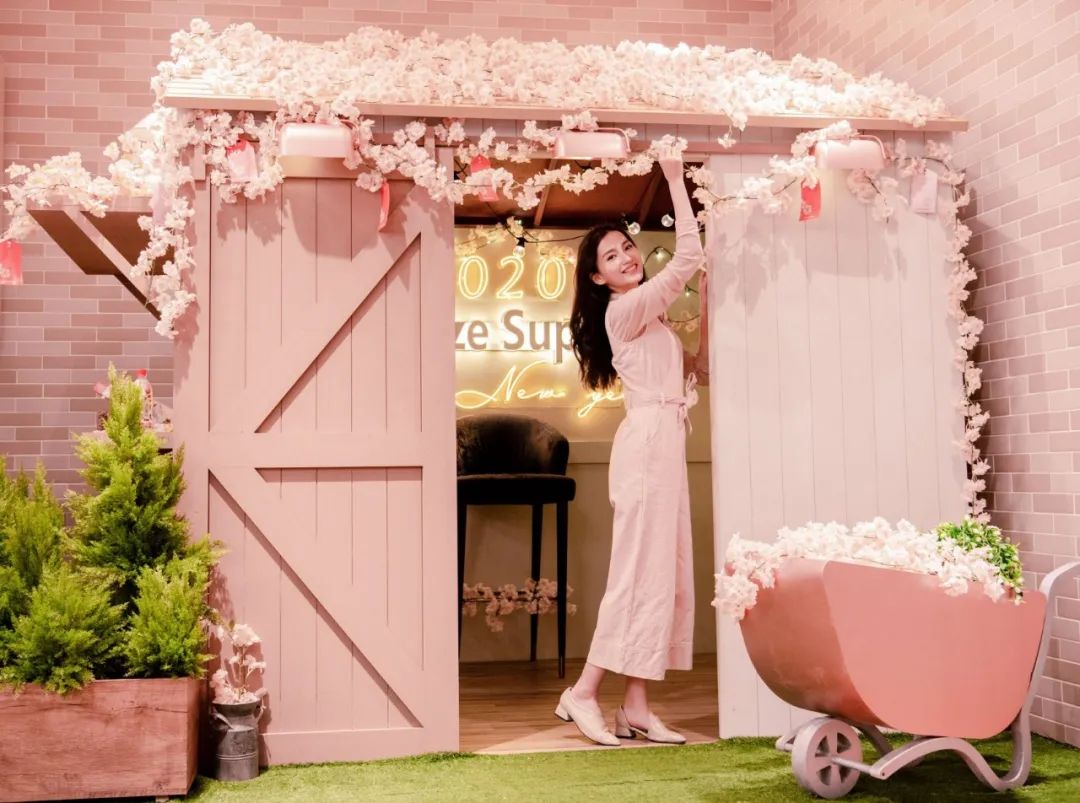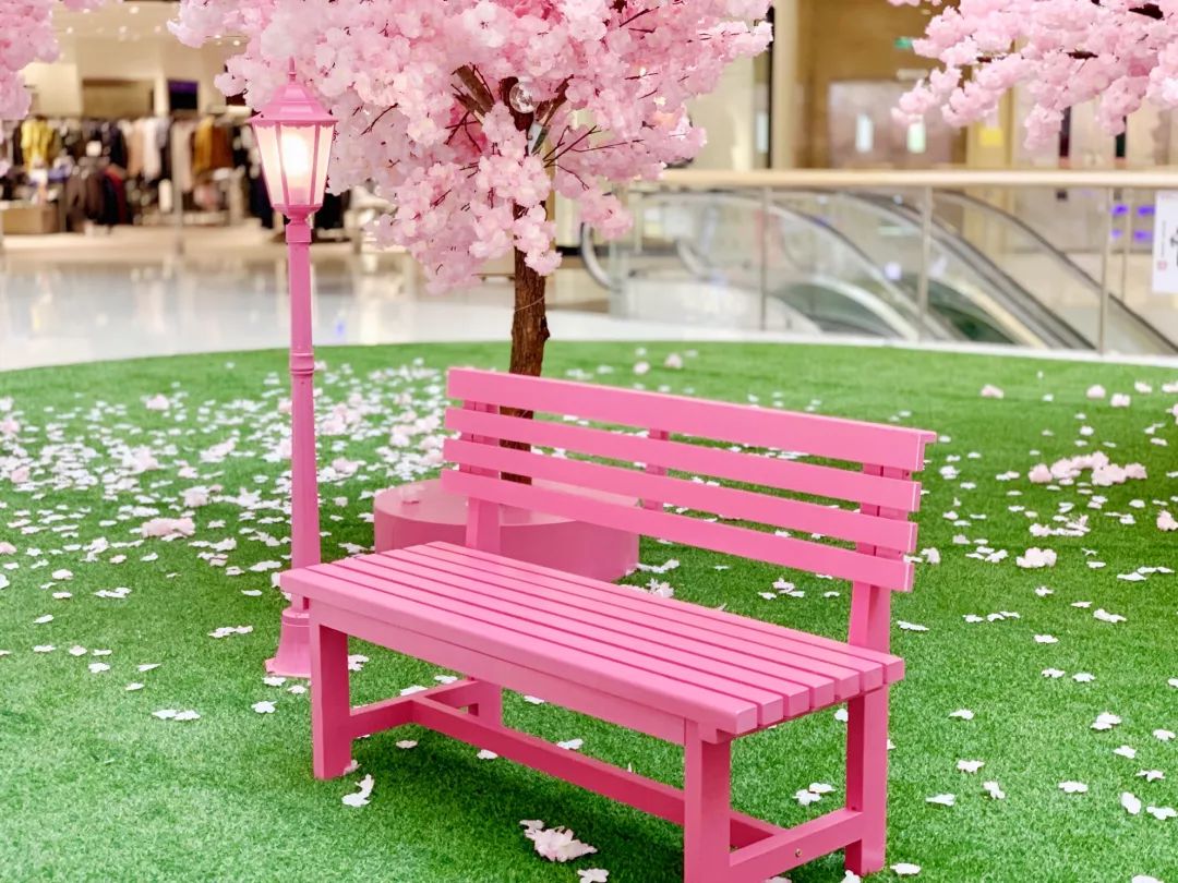 台北微风南山购物中心分别在三层楼不同位置设立樱花打卡点,1F空中繁花,B1甜美春樱,天台小屋,用粉嫩少女感的樱花营造浪漫空间,让顾客置身花海,感受春意的美好。