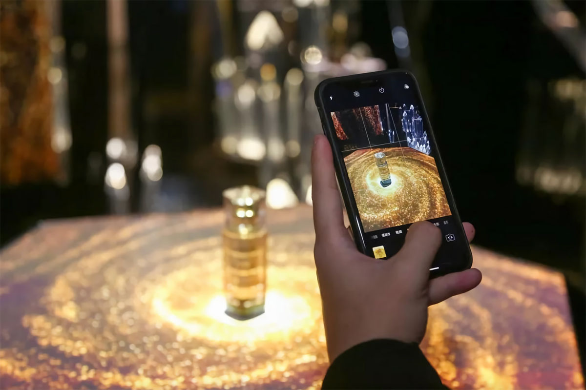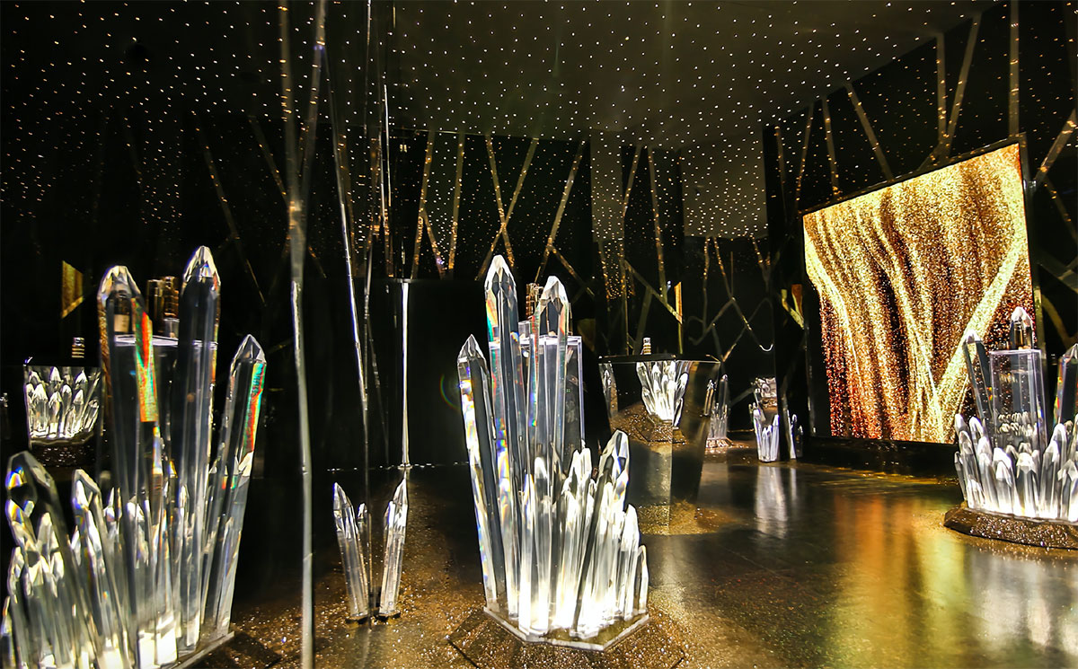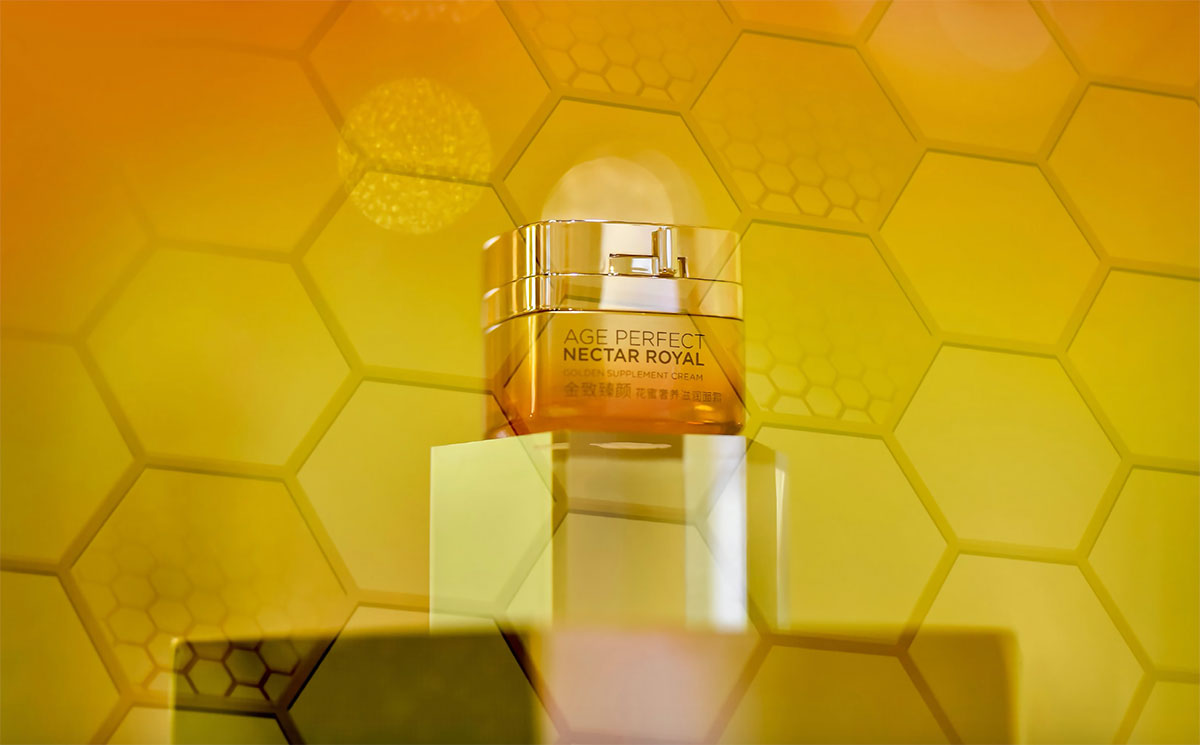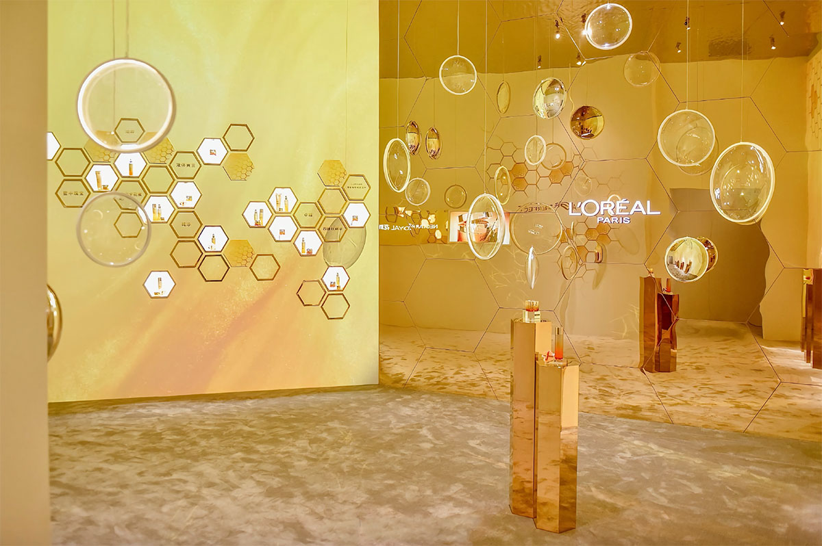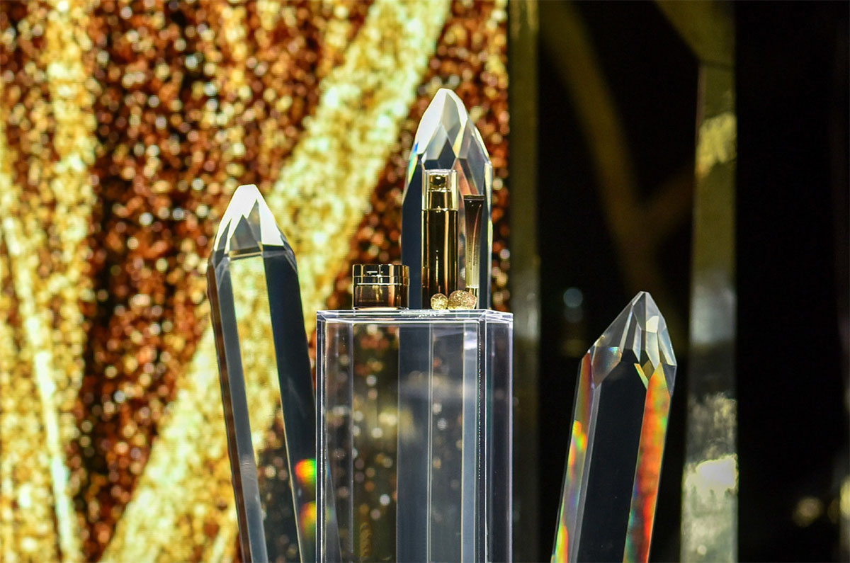 光影与镜面交织汇聚,展现花蜜奢养系列的独特成分,动态流金的墙面装置,仿佛置身鎏金岁月。各异水珠状造型展现该系列的莹润肤感,也彰显女性不同的美与自信形象。