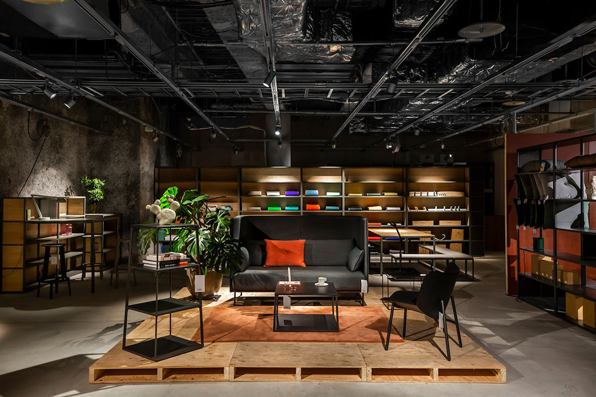 在整个空间的其余部分(仅由几根混凝土柱打断),布置了起居室风格的展示区,以展示该品牌精选的沙发,地毯和茶几。这些由彩色的墙板作为支撑,这些墙板也固定在天花板的金属框架上。