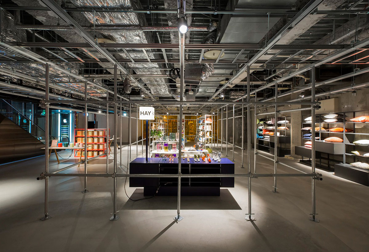 「HAY」是Rolf Hay在2002年创立的一家年轻的丹麦品牌。你可以把它理解为「家具界的ZARA」,主打小清新和多样化的快设计。Schemata Architects为丹麦家居用品品牌Hay设计的这家快闪店里,出现了脚手架构建成的隔断墙和木质展柜。