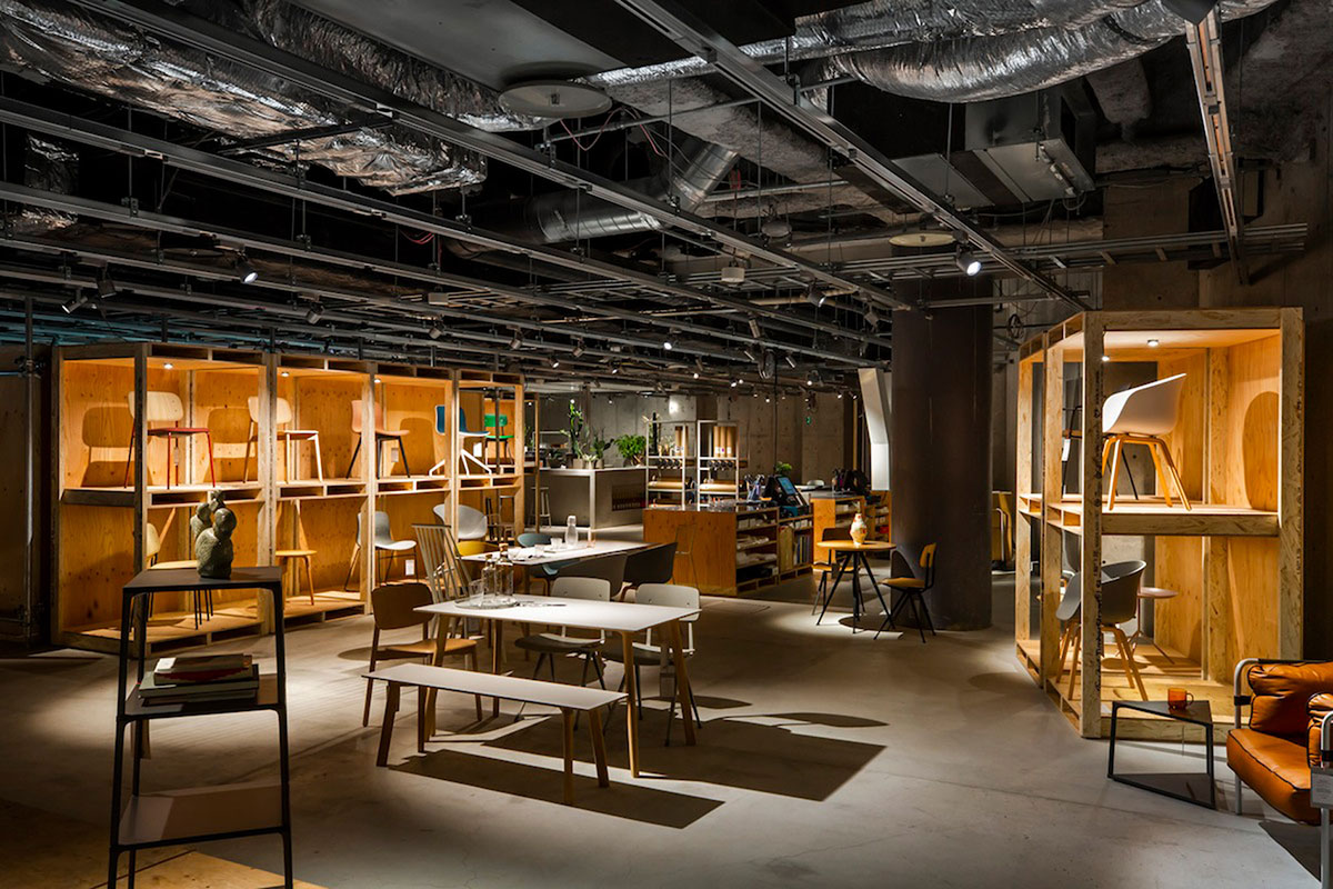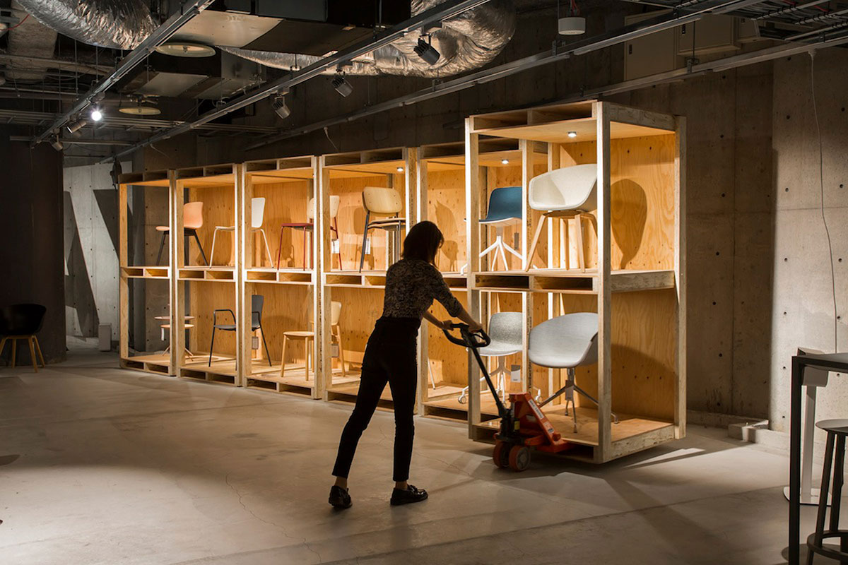 木材已经被用来建造商店的收银台和高大的存储单元,可以容纳品牌不同的椅子模型,所有这些都可以用托盘手推车移动。