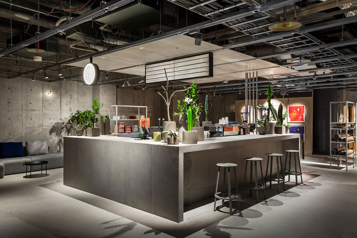 混凝土也已被用来形成一个小咖啡馆,顾客可以在那里买咖啡或点心,那里有相配的石灰色凳子。