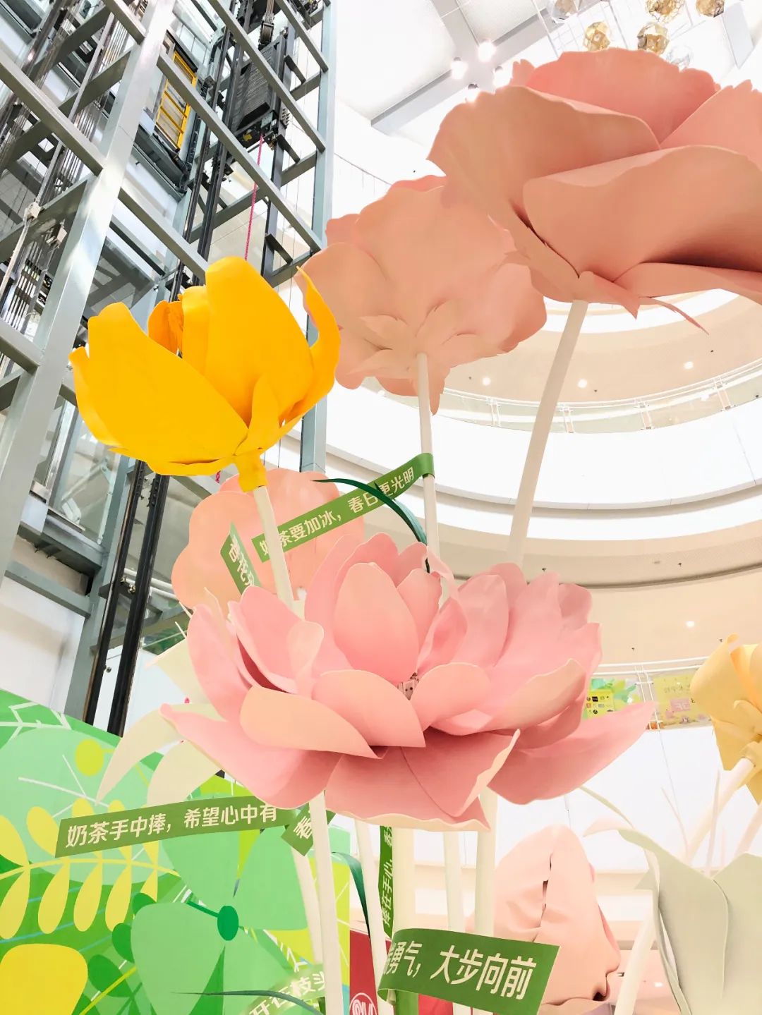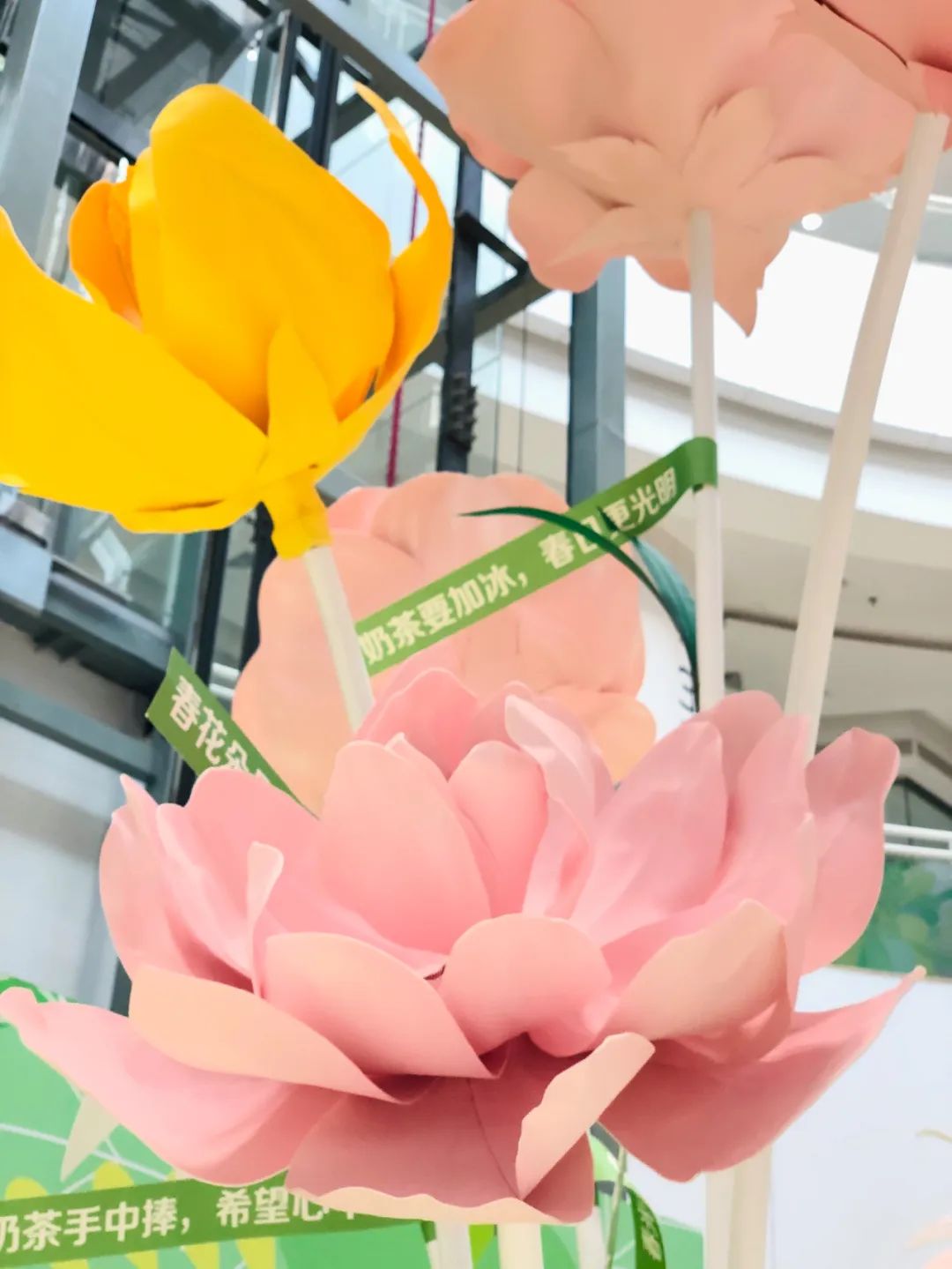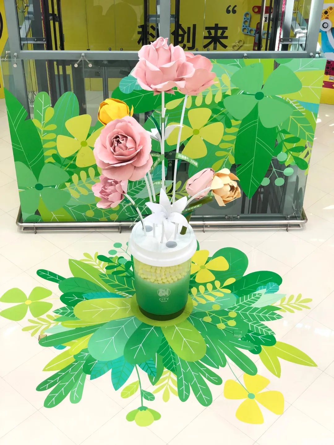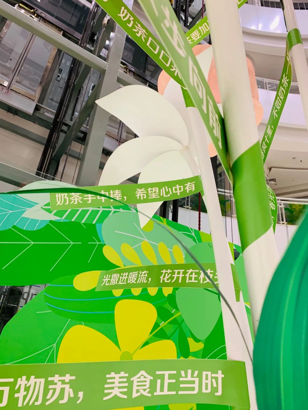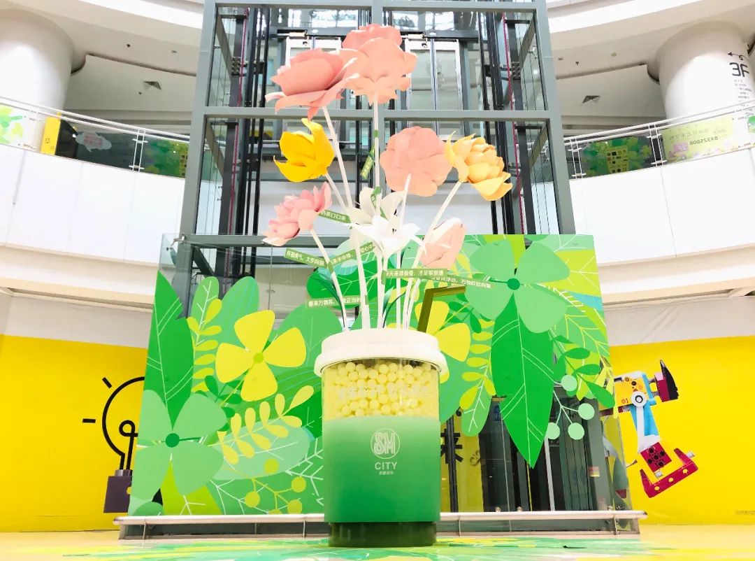美陈装置主体高达4.2米,视觉上以黄绿色为主调,搭配粉色、白色点缀其间,极致用心的“描绘”了一幅清新自然的春之图,让每一位路过的顾客都能感受到扑面而来的春日粉色浪漫气息!而高1.7米的巨型奶茶杯更是能让奶茶控们为之疯狂,满杯的饱满黄色珍珠,享用一口奶茶,收获一抹春天!