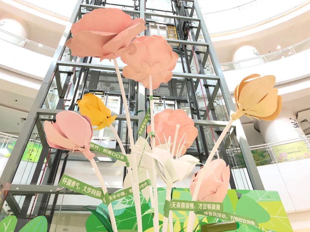 从装置互动性上讲,奶茶杯上方,九朵温柔色的花朵高低错落,当你轻轻靠近,无接触式感应系统自动启动,粉色的花朵伴随着透过天窗洒进来的阳光缓缓盛开,营造出一副欣欣向荣之势!而此时,耳边响起的是灵动的鸟叫声和轻快的春日音乐,让你彷佛置身于大自然之中……向阳花开,为你而来,这就是成都SM广场送你的“花开的惊喜”!