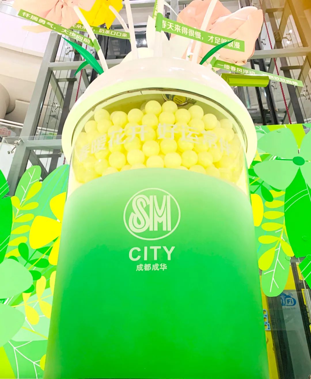 春来万物苏,美食正当时!在感受清新大自然时,更需要美食的加持,这一次我们不妨就从一杯春日奶茶开始……在美陈装置一旁,成都SM广场还准备了许多饮品类商家的推荐,喜茶、星巴克、一点点、CoCo奶茶……快来一杯你最爱的奶茶,来巨型奶茶杯旁打卡吧!做朋友圈第一波奶茶客,从此开启你的美妙春天!