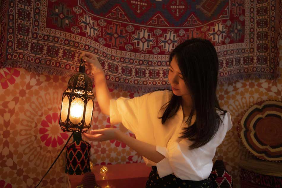 进入6米高仙人掌房子内部,流连其间,目光所至,珊瑚橘背景墙为主视觉色调,顶部悬空挂满竹编包,搭配流苏吊灯,以落地烛台、壁毯、民族风色调的镜子和柜子搭配,整体呈现出摩洛哥客厅调性,完全为你复刻了一个理想的摩洛哥生活。