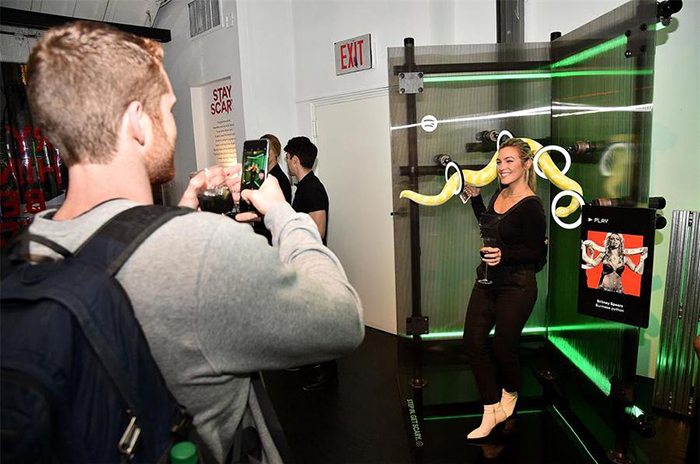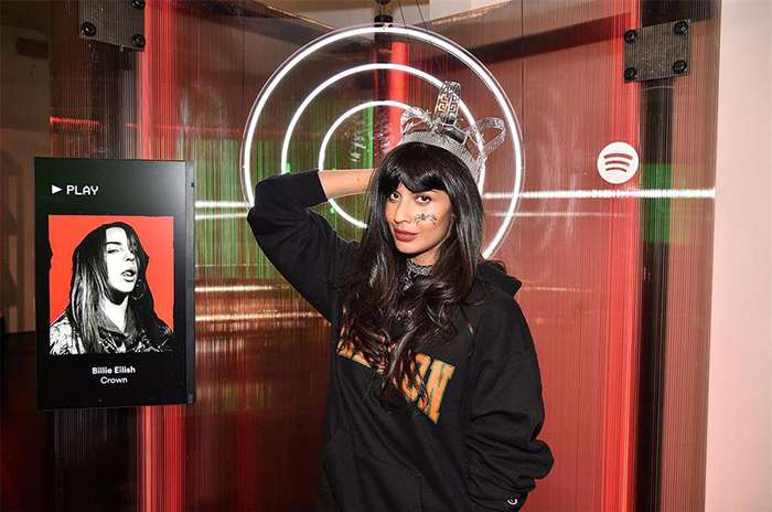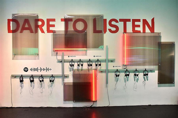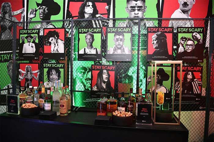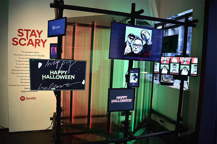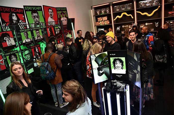 Spotify(声破天)流媒体音乐平台在纽约举办了一场“保持恐怖”的公众快闪活动。据媒体报道,这个活动现场的特色是服装、道具和摄影,灵感来自“敢于突破界限的艺术家”,并为观众免费赠送了服装(先到先得),他们可以与“敢听”电台进行互动,重点介绍了出于艺术追求而走出舒适区的音乐家,并与他们合影留念。12位特色音乐家与Spotify合作策划了万圣节灵感的装饰道具,比如Billie Eilish受她的“You Should See Me in a crown”音乐视频影响设计的蜘蛛皇冠。