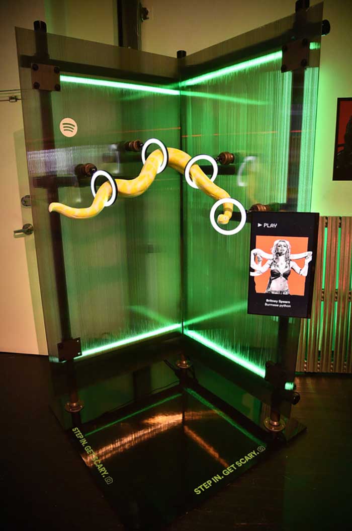 该活动的一大亮点是Spotify副总裁、全球执行创意总监Alex Bodman的演讲,他向来宾解释了所展示的每个服装配饰背后的灵感,其中包括小甜甜布兰妮·斯皮尔斯2001年演出时的蟒蛇。此外,还展出了拉丁艺人的音乐录影带和副本等等与音乐家有关的内容。