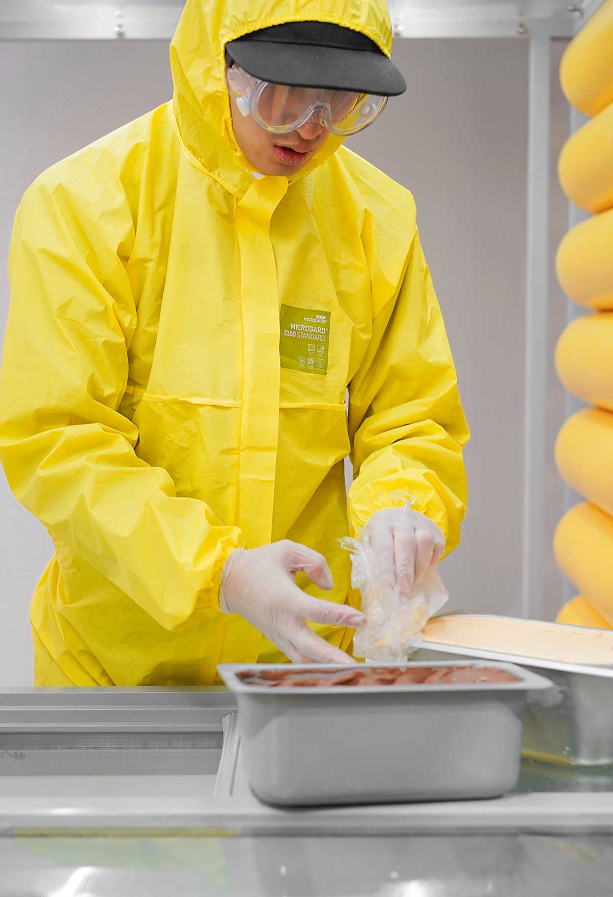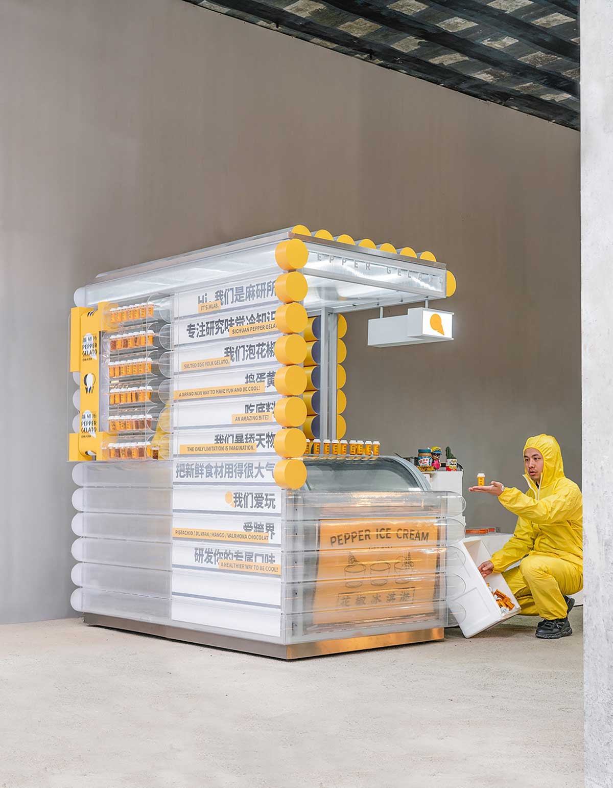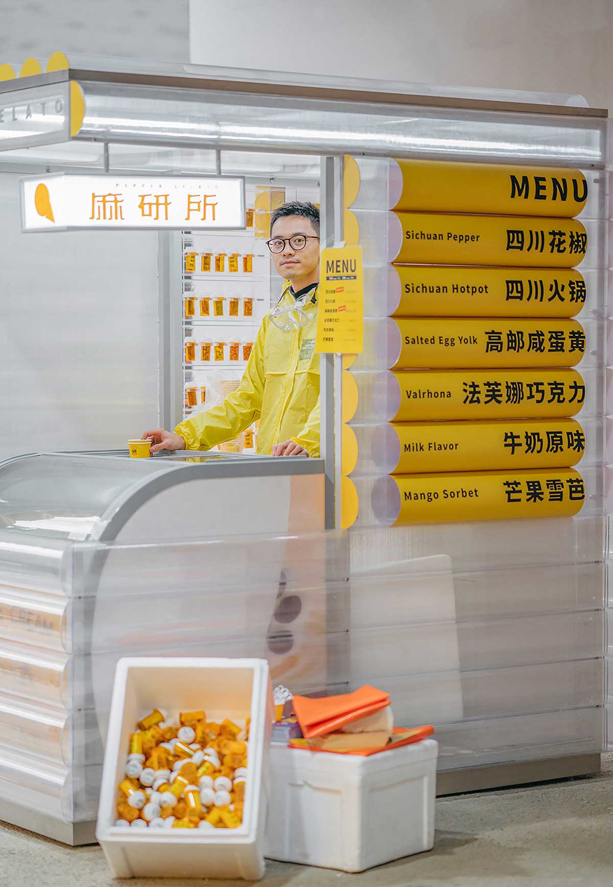 透明亚克力展示柜中放置实验瓶,瓶中展示各种四川特色食材,现场顾客在品尝冰淇淋后,可以随机带回一个实验瓶留作纪念。在我们看来试管这样的实验容器,承载着不同的可能性和创新,这也是麻研所追求的精神内核。
