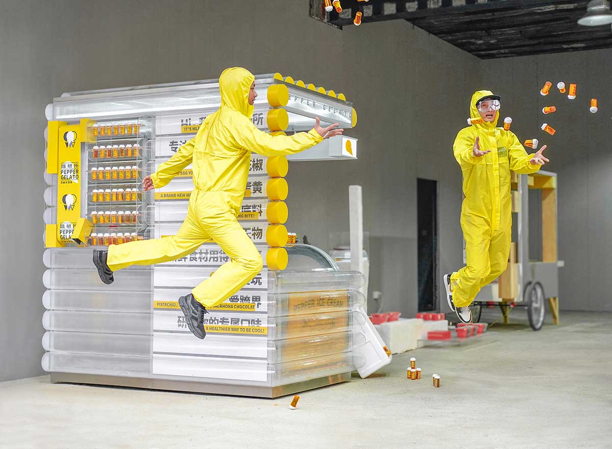 我们通过提取实验室试管的元素,把它作为空间外立面的肌理。通过颜色、平面元素、灯光等方式让它形成一个具有时尚趣味的空间装置。在展示窗口,还有赠送给到现场朋友的试管药剂,里面收集了最经典的四川特色食材,也是麻研所冰淇淋的原材料。