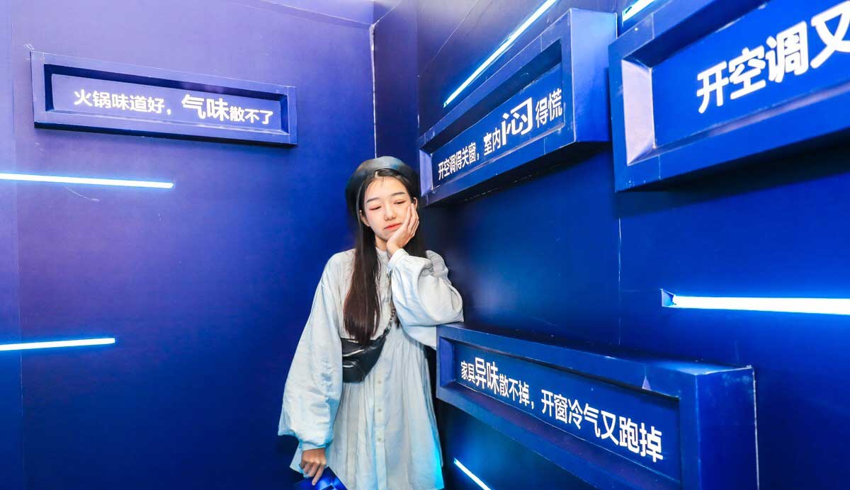 抬眼望去,只见快闪店的唯一入口以“G”为门型,通过灯光与线条的结合营造出纵深的视觉效果。由灯光线条构成的“G”形入口,不仅营造出一种时尚的科技感,强化了GREE的品牌印记,而且更能吸引年轻消费者的注意。走进去,记者随人群穿过一个U型神秘的通道,通道中通过灯管与文字,讲述了展现空调的用户痛点,例如,“开空调得关窗,室内闷得慌”“开空调又开窗,电费花光光”“头昏脑胀心慌慌,氧气减少得开窗”等门窗紧闭呼吸沉闷、开窗换气费电、甲醛异味等。那么,什么可以解决这些空调的使用痛点?格力给出的答案是的风无界新风空调。为了让参观者深入了解格力新风空调是如何解决用户痛点的,快闪店对新风空调进行了分区引导展示。