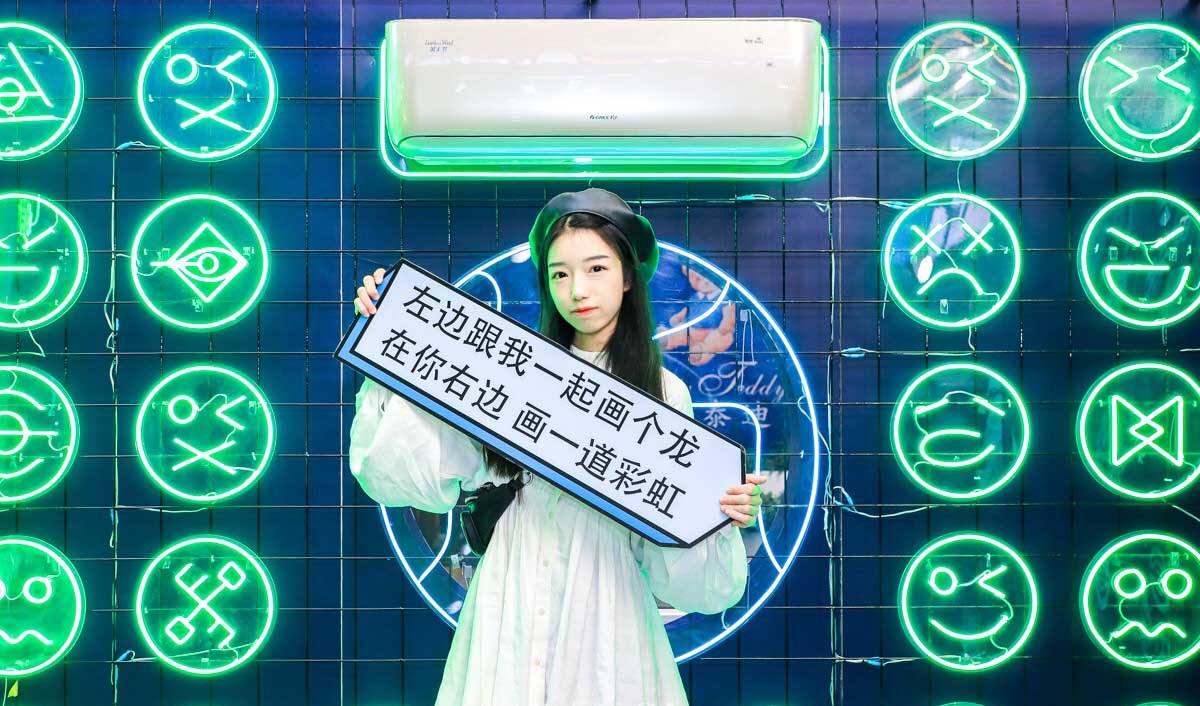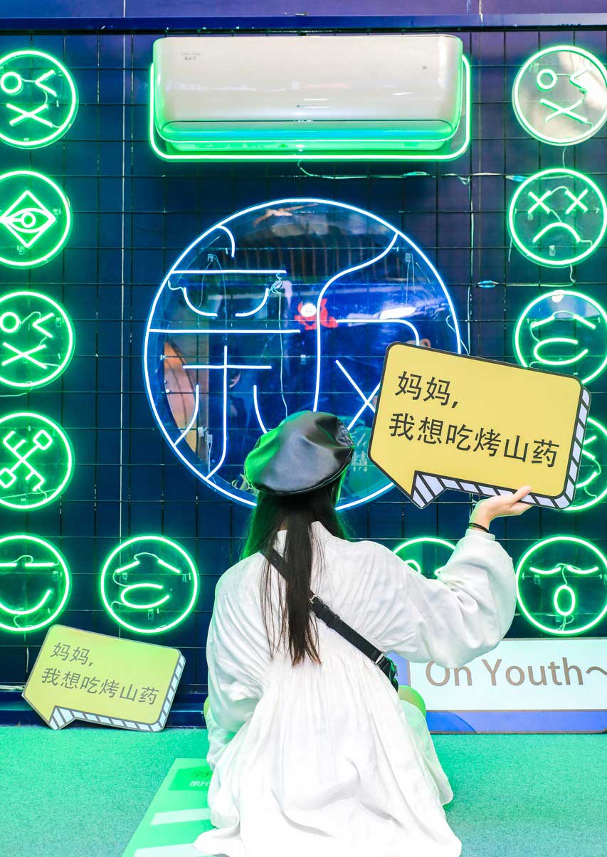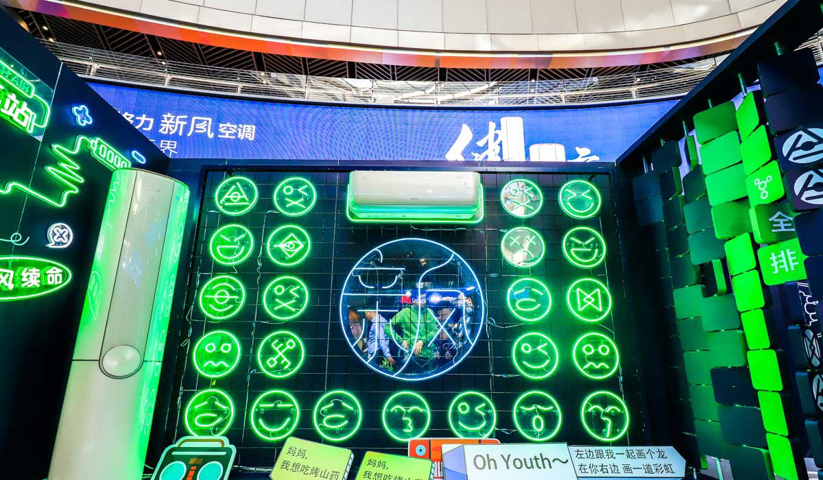 紧接着是“新风供氧站”,也是快闪店的“网红打卡区”。在这个区域,快闪店将新风空调柜机、挂机与代表产品功能与优势的神秘符号融合,以夸张的形式展现了出来。《电器》记者看到,作为“网红打卡区”,很多时尚的年轻人慕名而来,在这里举着代表年轻人态度的语言标签拍照,大方展示自己的风采。