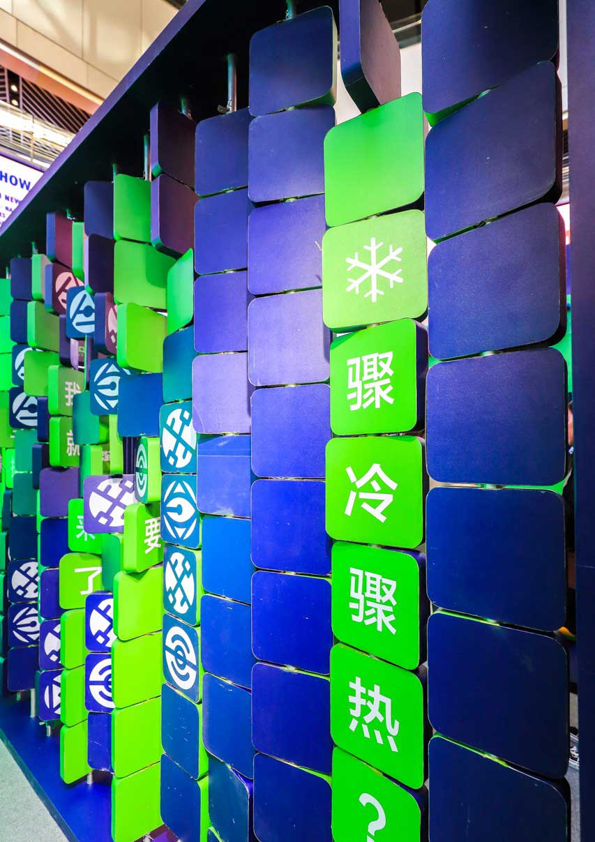 在“新风大起底——骨牌旋转区”,翻牌区域正面(蓝色)为新风空调五大功能性神秘符号,翻牌区反面(绿色)为新风空调的五大功能特点,参观者通过翻转骨牌即可获取信息。这个区域将新风空调的好处展现得更具娱乐性,让年轻消费者轻松“get”风无界新风空调的关键功能。
