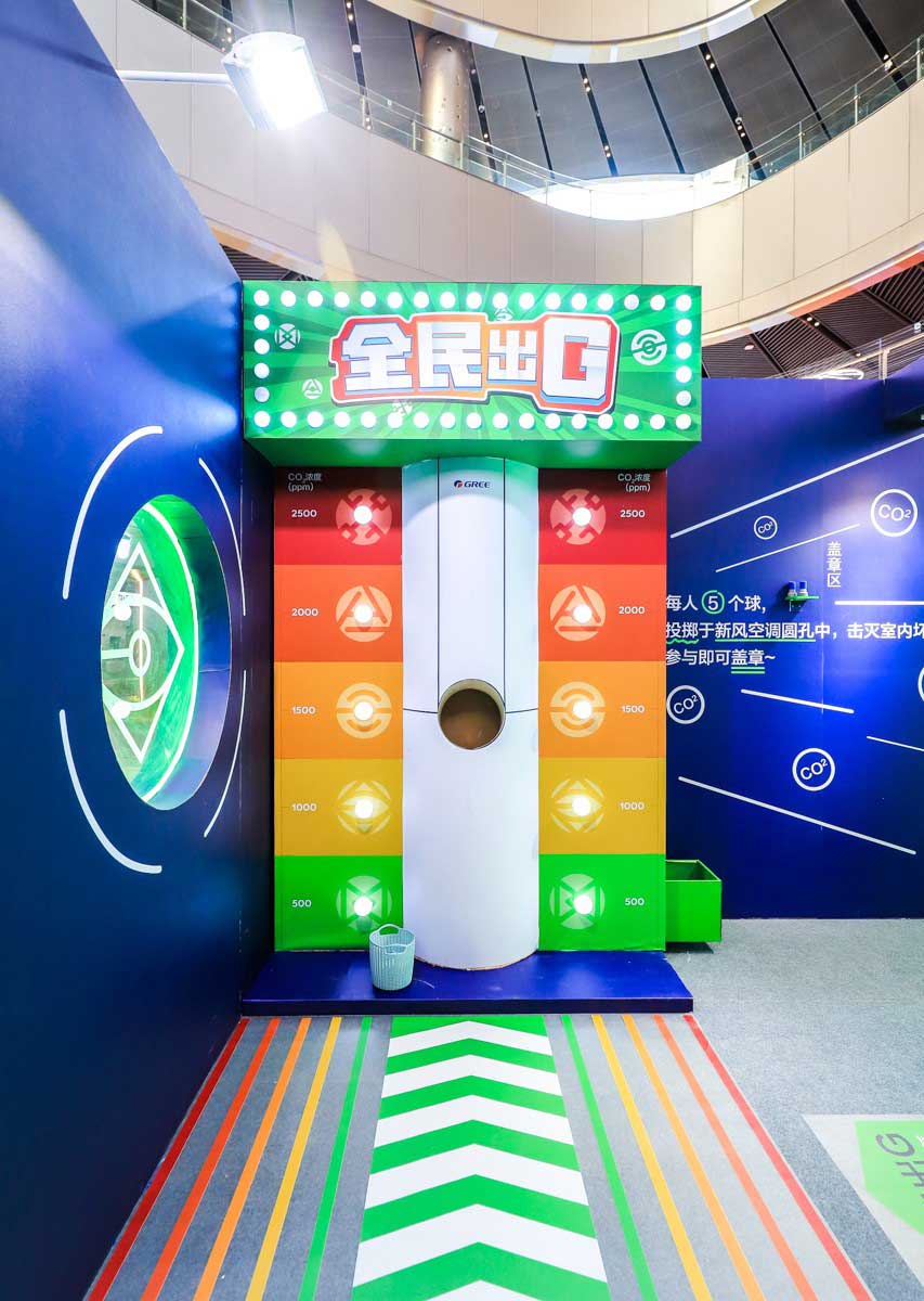 在“全民出G——掷球游戏区”,快闪店引导顾客将带有氧气标识的球(共5个)掷入空调的中心圆孔中。每掷一个,灯自上而下亮起,表示二氧化碳浓度在降低,当5格灯光全部亮起后,表示游戏通关,上方的跑马灯亮。这个区域让消费者通过游戏形象地体验新风空调排出室内浊气,使室内空气变得鲜氧、清新的过程。