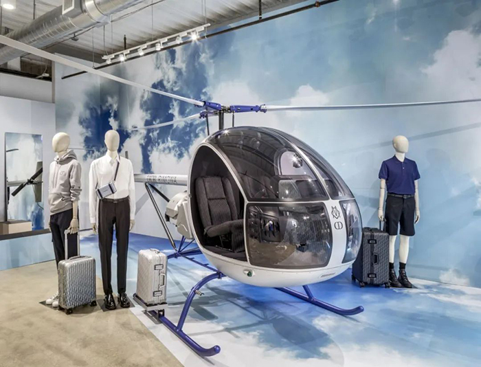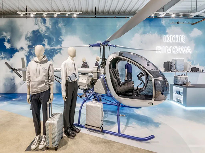 随着新一季的到来,DIOR持续将触角伸向更多领域,不仅与德国最知名的高级行李箱品牌Rimowa联手合作,也和拥有近两百年历史的英国百货Harrods共同打造特色快闪店,成功将「注意力经济」发挥极致。快闪店有浮云的背景和一架真正的直升机,上面涂着RIMOWA的标志性铝灰色和特别设计的座舱内部,座椅由设计师迪奥(Dior)斜向帆布装饰马克·博汉( Marc Bohan)。