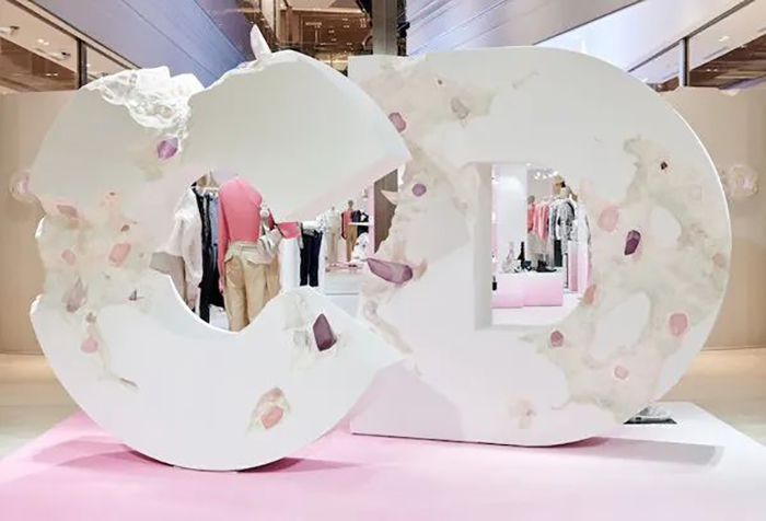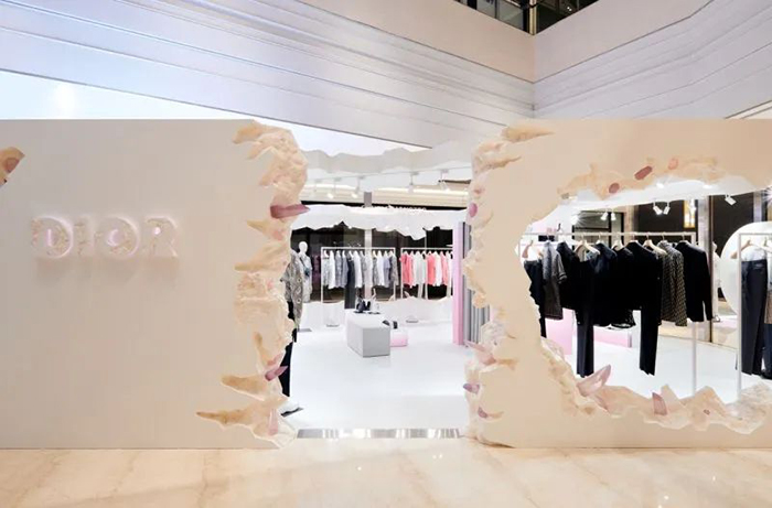DIOR在台北信义区微风南山开男装快闪店,把秀上男装创意总监Kim Jones携手拥有未来考古学美誉的美国跨界艺术家 Daniel Arsham 共同合作的艺术概念带进现场,打造废墟感墙面,硕大的品牌缩写 CD 字样搭配斑驳处露出的水晶设计,整个空间呈现出缩小版的秀场氛围,适度搭配粉的色彩点缀,让这个纯白的空间除了有未来感外,也拥有优柔内敛的优雅气息。