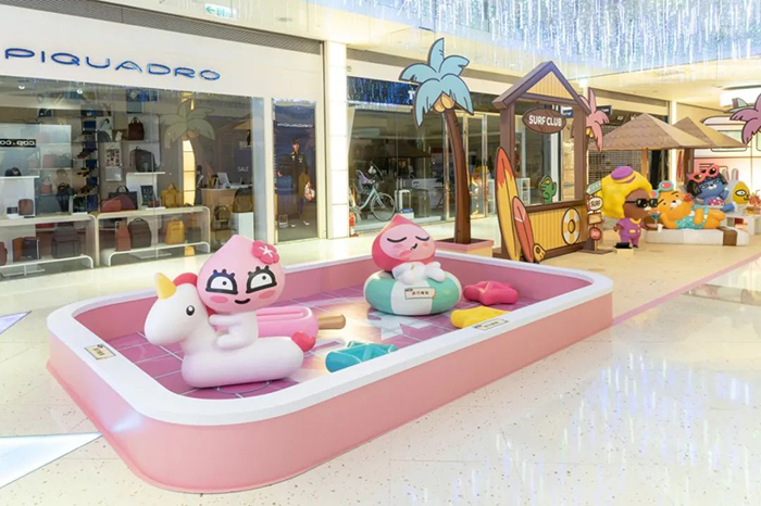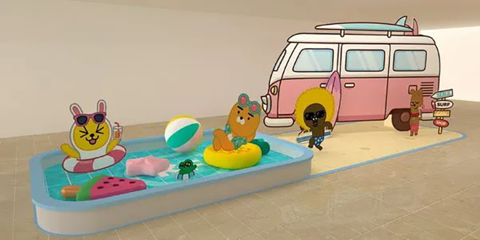 KAKAO FRIENDS快闪店以「Beach Hotel」为主题,现场打造了海滩饭店、游泳池、海滩Bar等四大造景,可爱的莱恩与桃子等好友穿上应景的夏日海滩装等着粉丝们合影打卡。