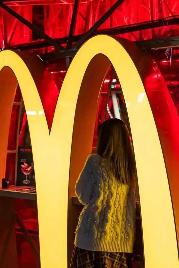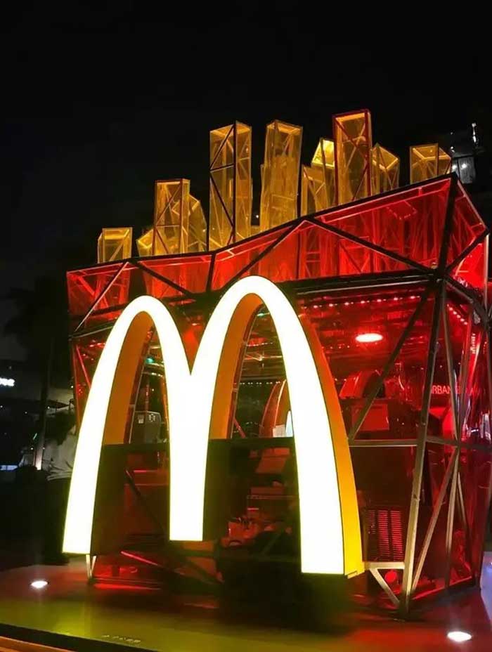 麦当劳的快闪店空降深圳,虽然店铺空间面积不足50平米,但麦当劳的经典红黄双色及薯条外观设计,极具辨识度。深圳麦当劳快闪店以混搭工业风钢架结构为主,几何造型与透明墙面形成“赛博朋克”的即视感。明亮的色彩与品牌标志将快闪店的商业效果发挥的淋漓尽致。