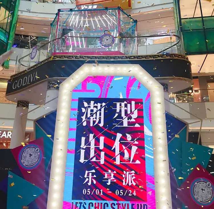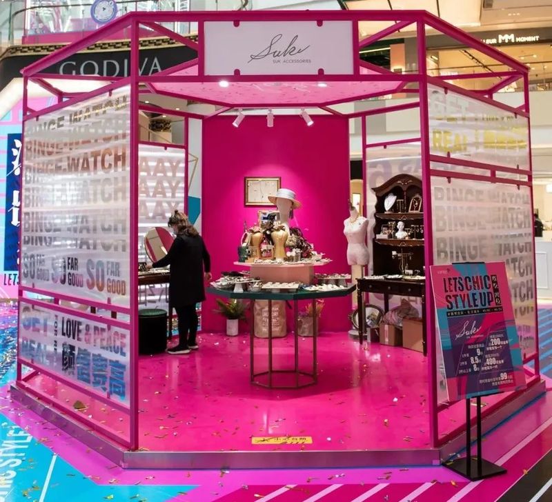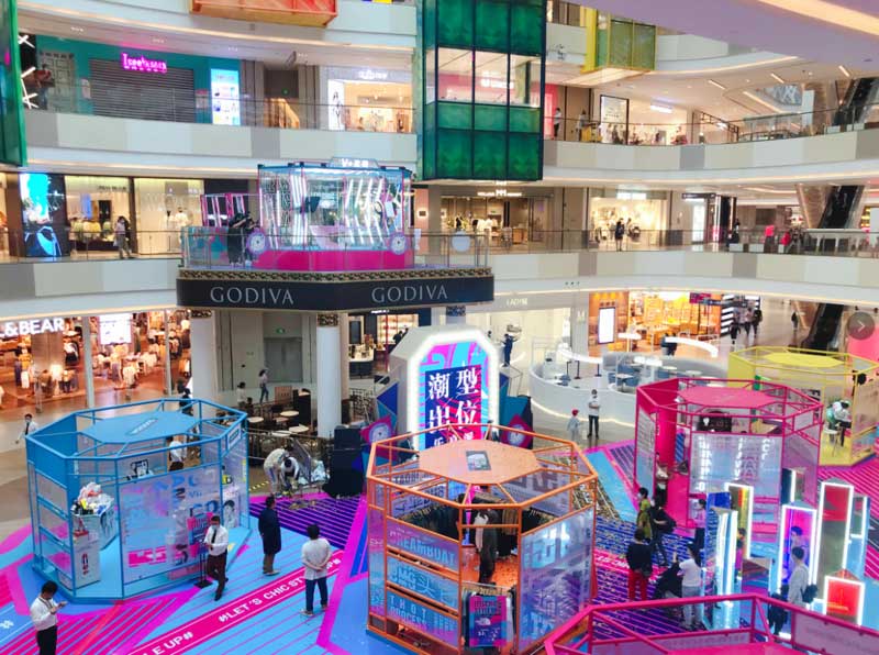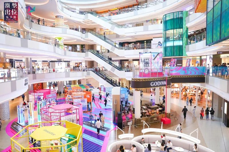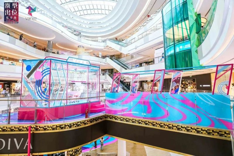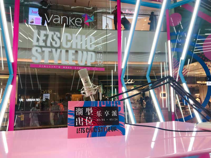 此次七宝万科广场别出心裁,巧妙运用商场中庭内得天独厚的环境优势,在乐聚广场上方创造出一个“悬浮”空中的实体直播间。直播间下方的场地上则分布着色彩缤纷的“高颜值”潮流品牌快闪店。