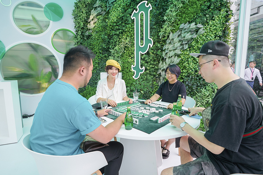 空间呈半开放式格局,虽然整体面积不大,但也区分了几个不同区域,可以有不同的体验。入口处的“气泡”装置十分显眼,一看到大脑就不自觉、非常快速地脑补出“Bubble~ Bubble~”,以及 Perrier 冲劲十足的口感。还直接在活动现场一侧特设的成都场创意区“开”了一桌麻将,果然够成都!