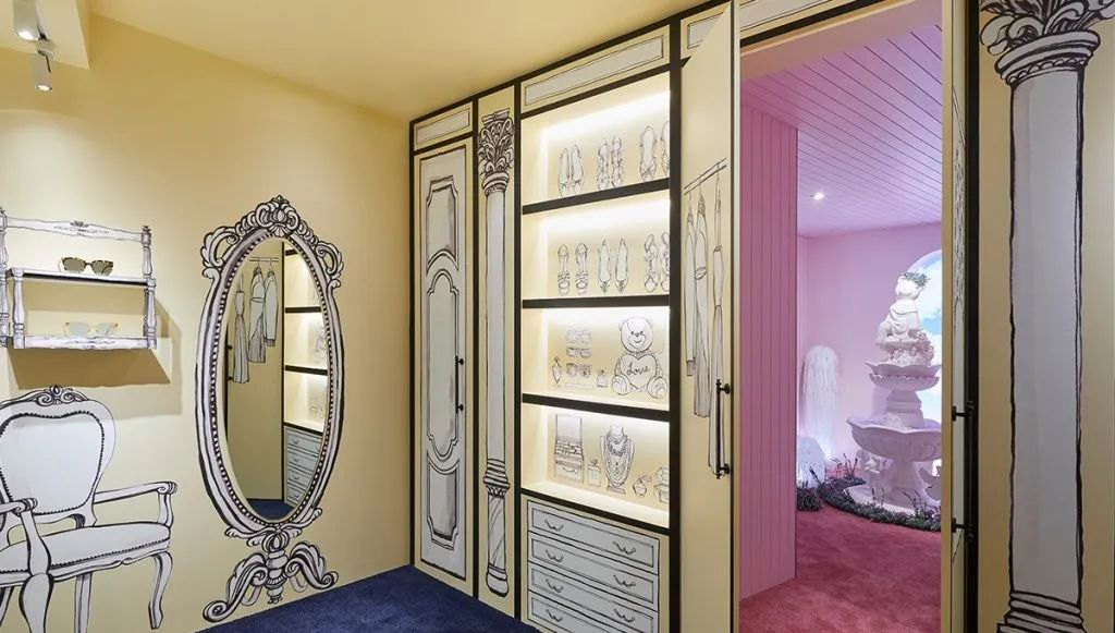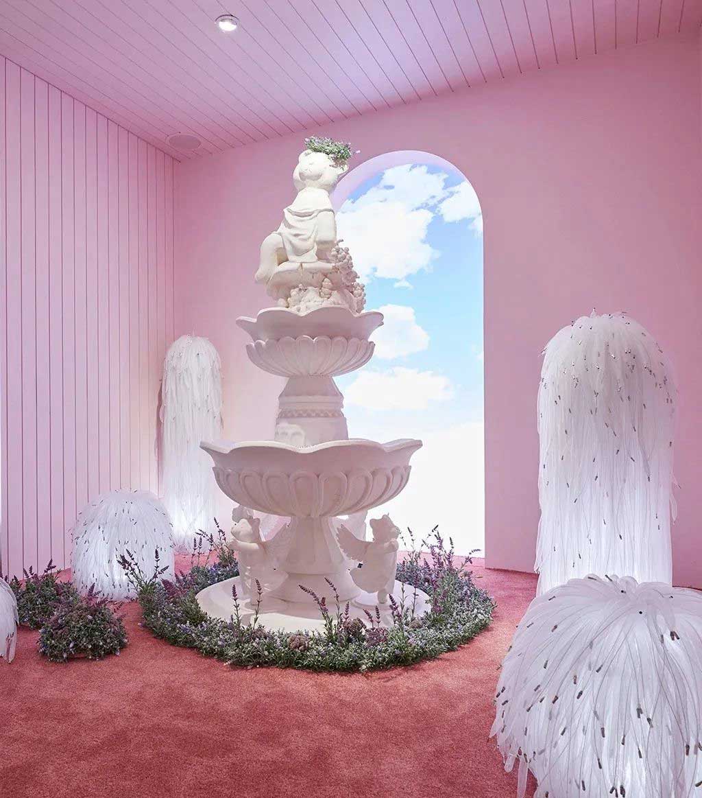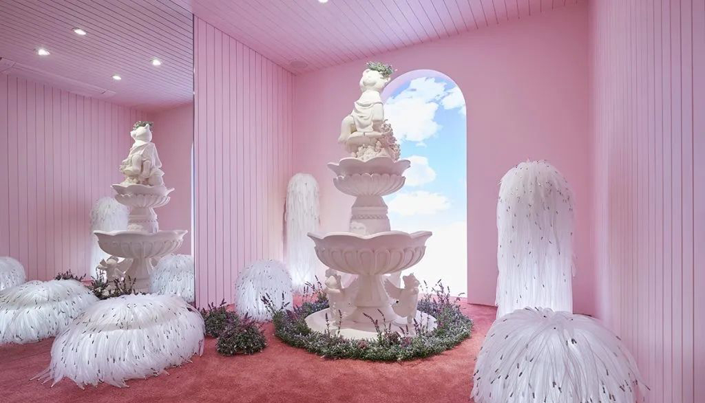二层DREAM ROOMS由休息室、厨房、更衣室和秘密房间(泰迪熊房间)组成,四间各具童话风格的房间,构成完整且充满浪漫想象的童话世界。打开更衣室的一侧柜门,充满梦幻氛围的粉色秘密房间便映入眼帘。驻足于泰迪熊喷泉前,可以看到被彩虹所映衬的天空,让人仿佛置身于彩虹映衬下的童话世界。