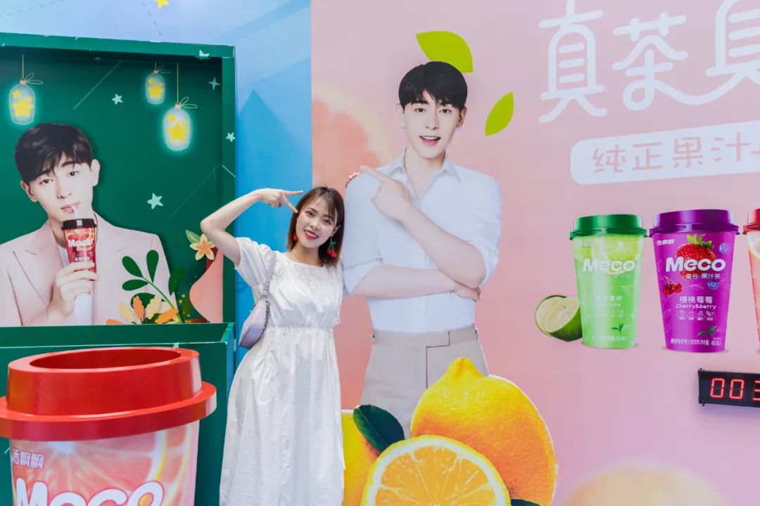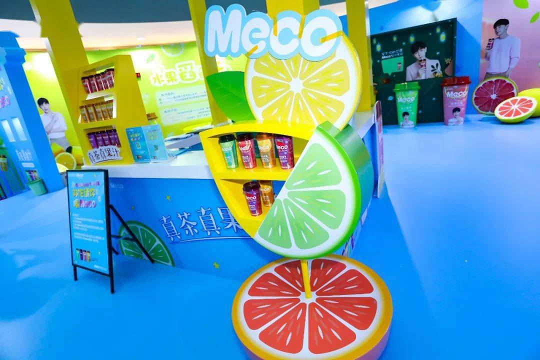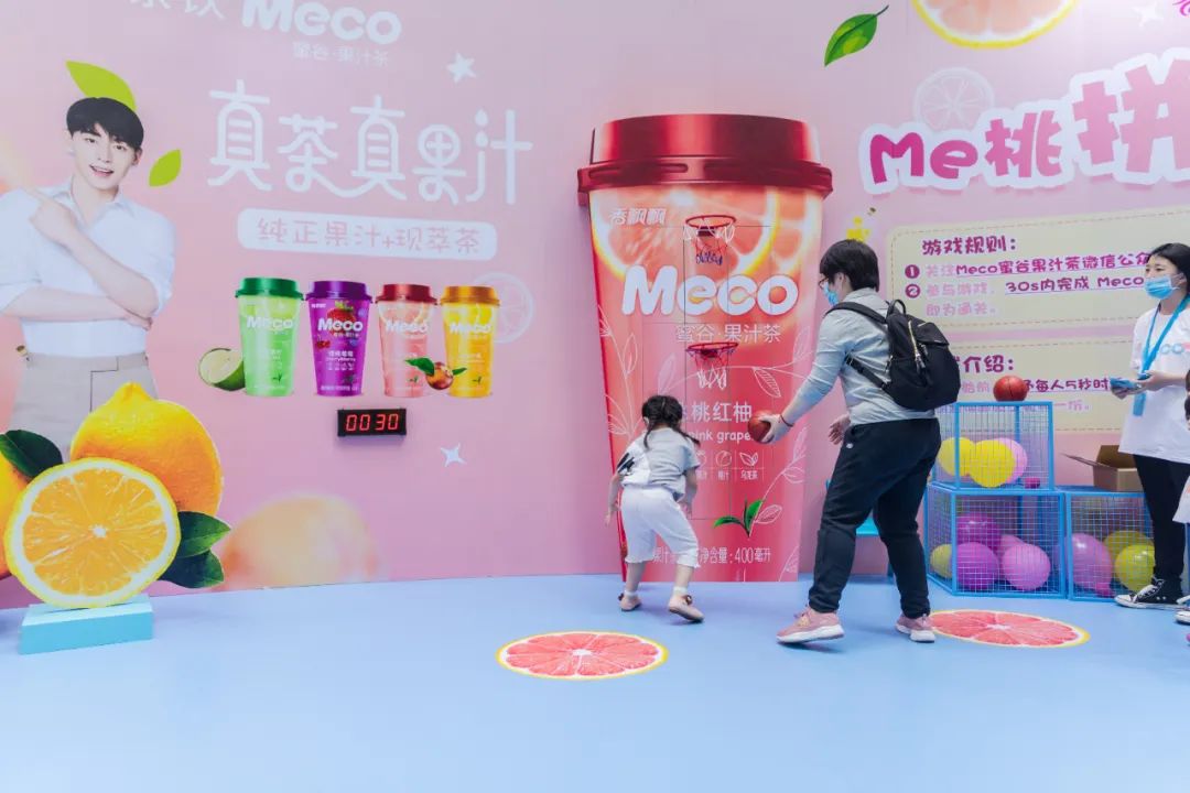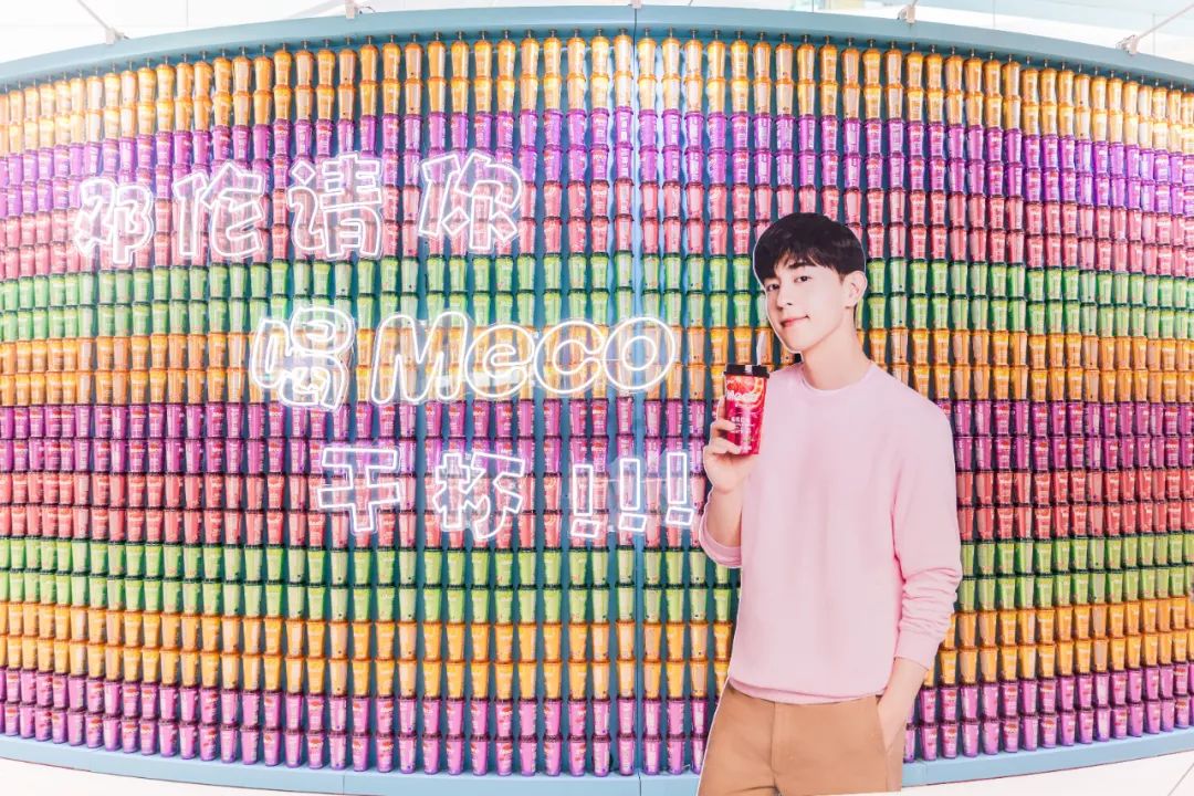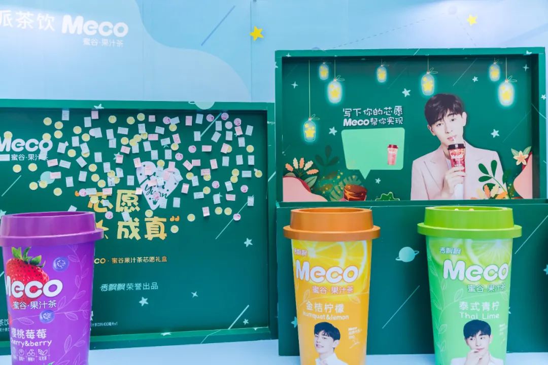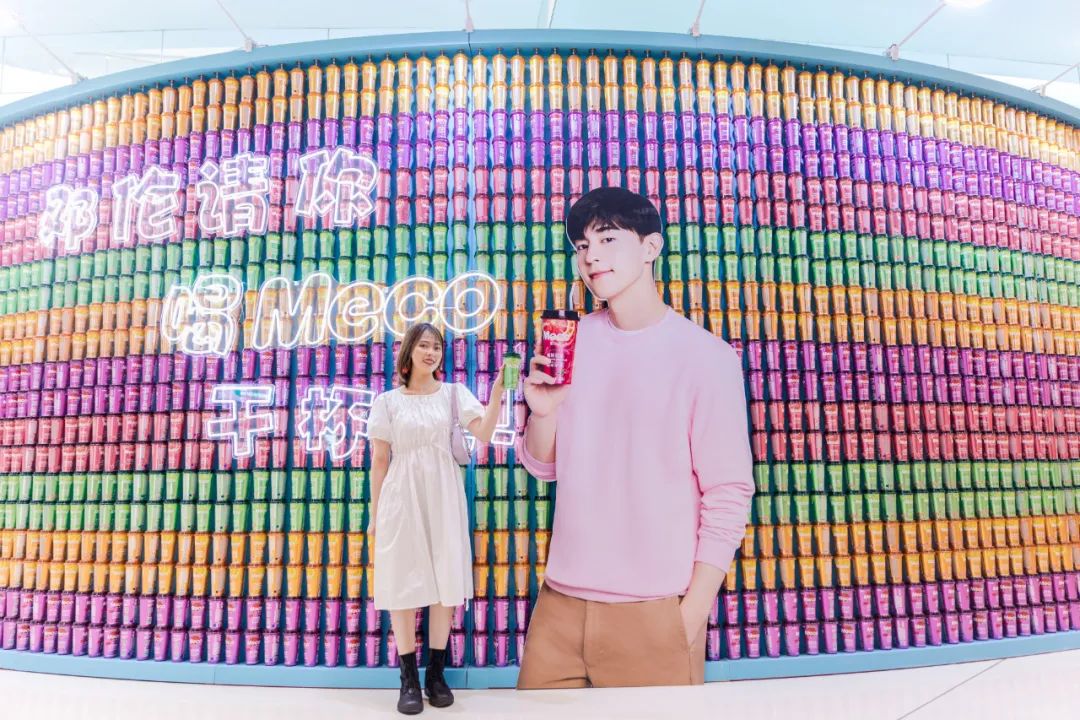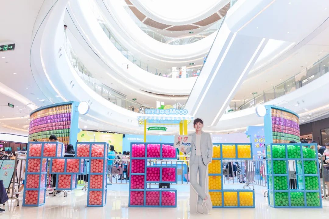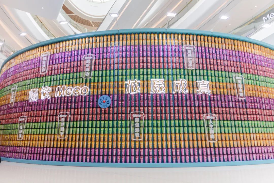 Meco快闪活动现场,许多好玩有趣的亮点让人欲罢不能,整整一万杯果汁茶打造出来的快闪店,光是看外表就气势恢宏,绝对是一个很值得打卡的地方。快闪店入场处,四色海洋球定制的Meco立体字,每个字母都代表了果汁茶的一种经典口味,也太有创意了吧!快闪店背面还有一座芯愿主题墙,脱单成功、颜值爆表、瘦成一道光,满满的的少女心呀!