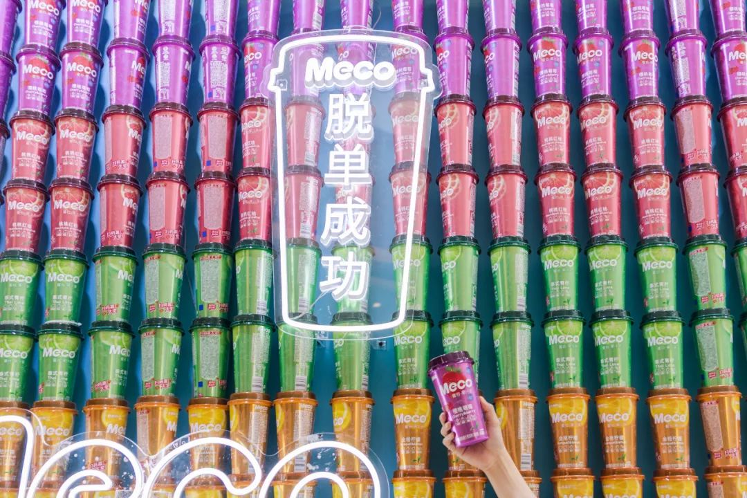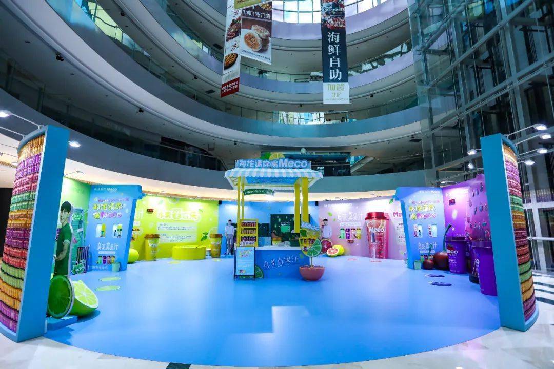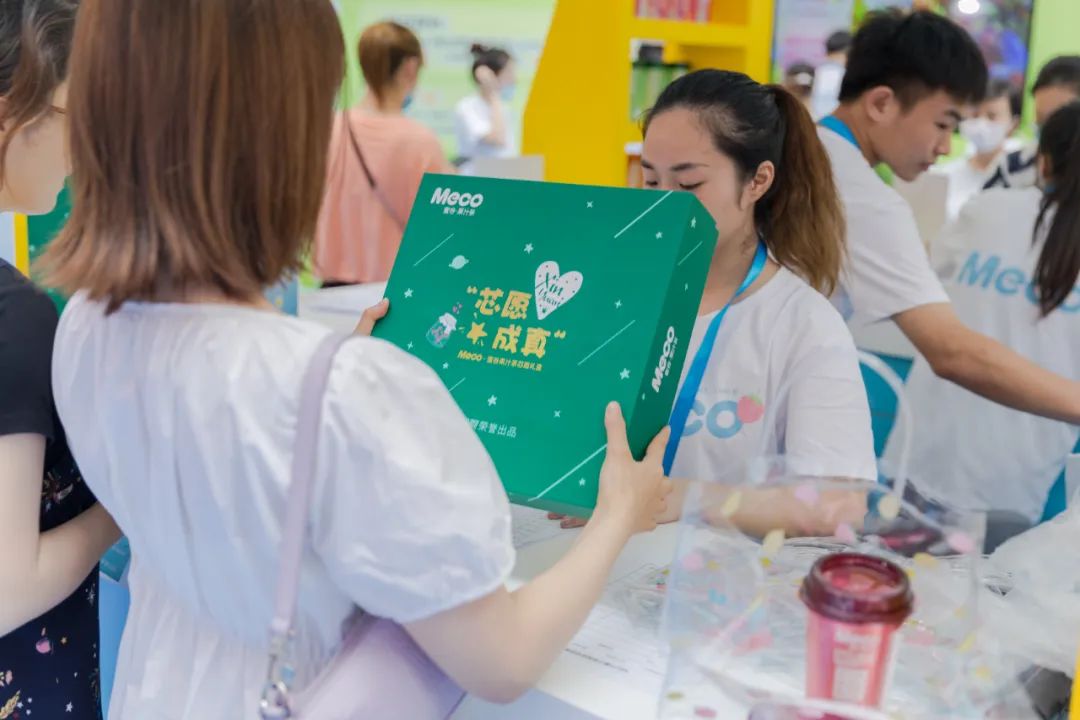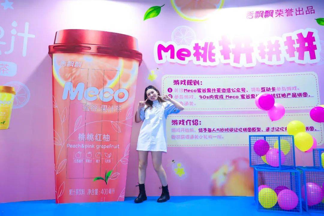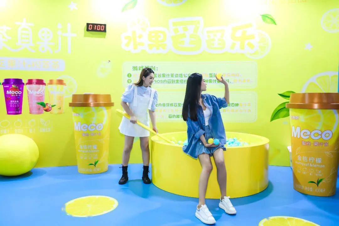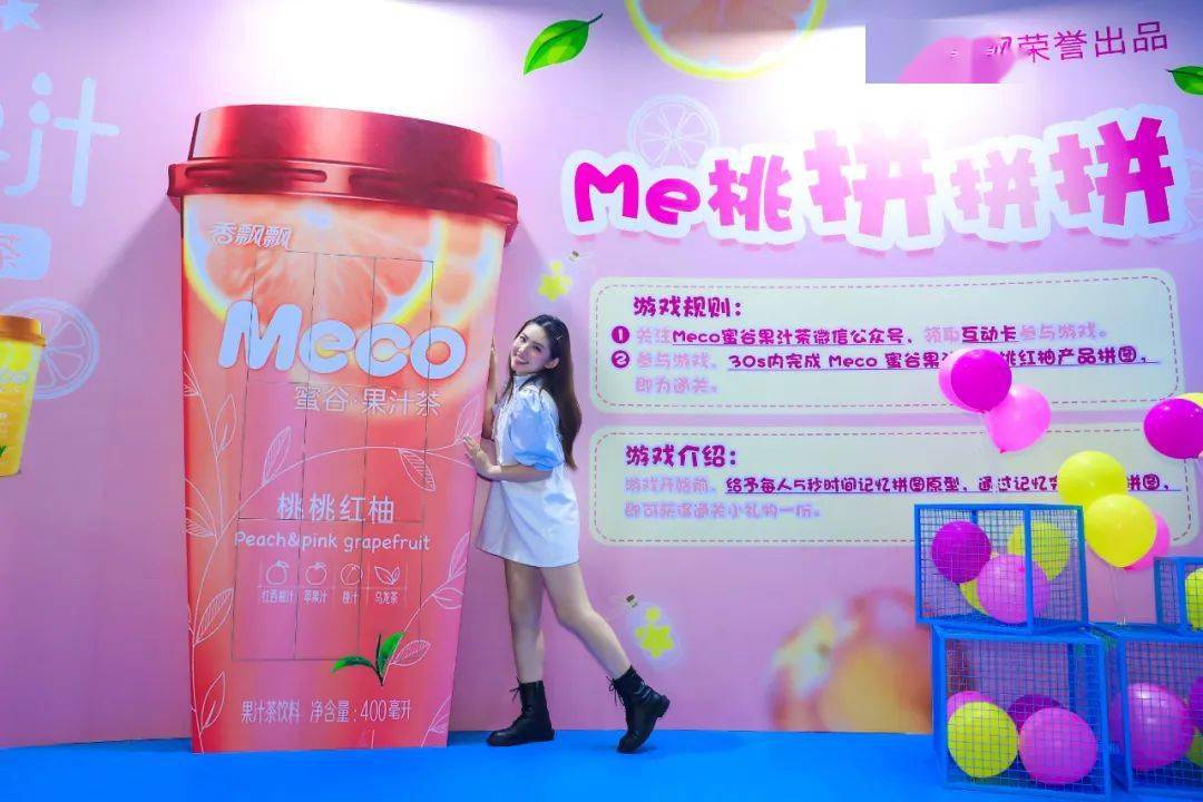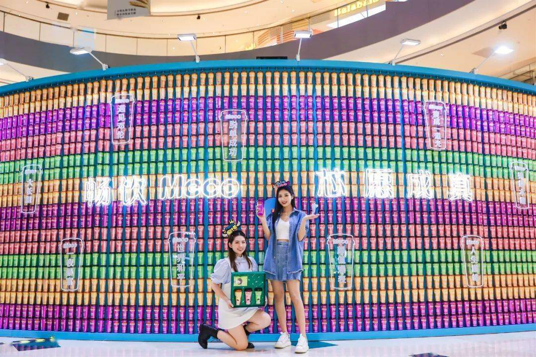 Meco快闪活动现场,许多好玩有趣的亮点让人欲罢不能,整整一万杯果汁茶打造出来的快闪店,光是看外表就气势恢宏,绝对是一个很值得打卡的地方。快闪店入场处,四色海洋球定制的Meco立体字,每个字母都代表了果汁茶的一种经典口味,也太有创意了吧!快闪店背面还有一座芯愿主题墙,脱单成功、颜值爆表、瘦成一道光,满满的的少女心呀!