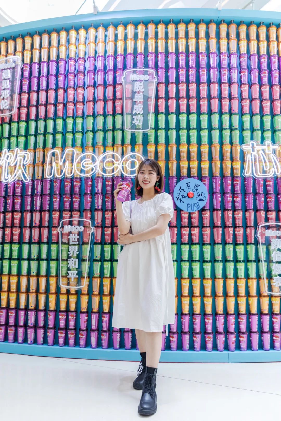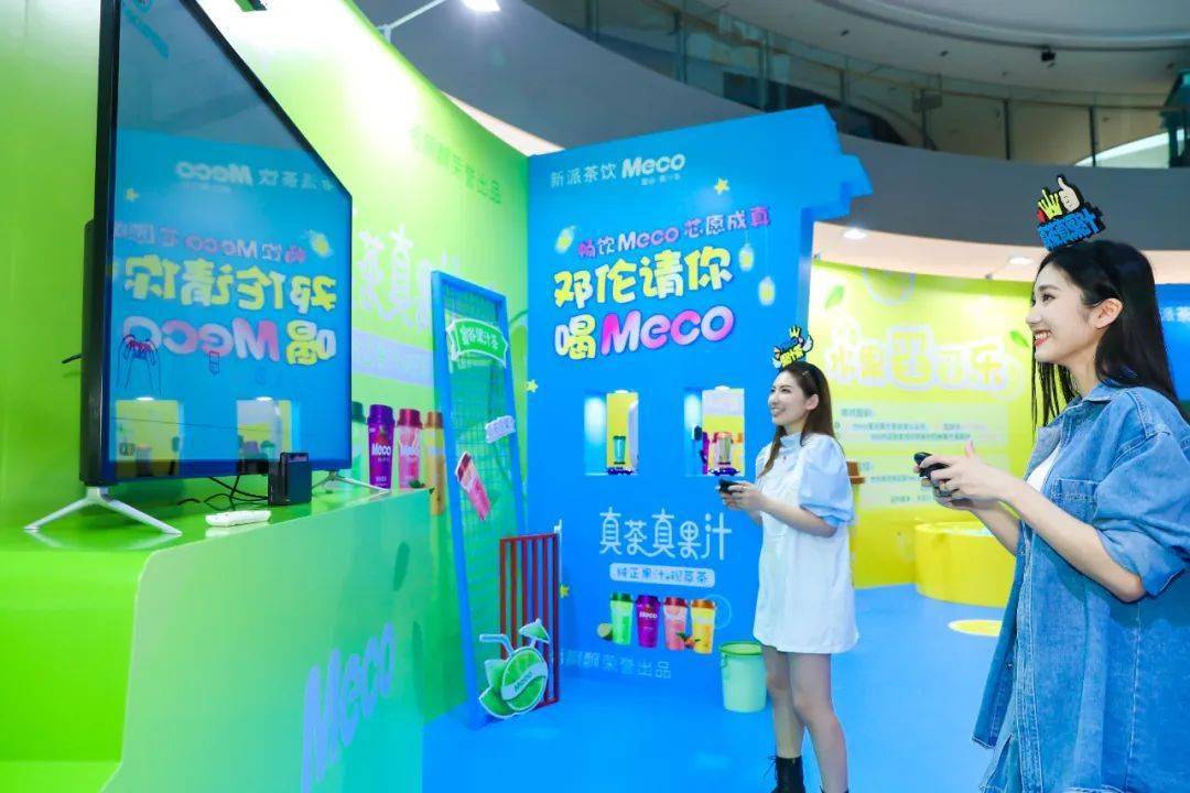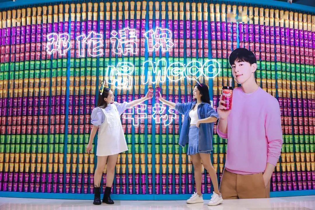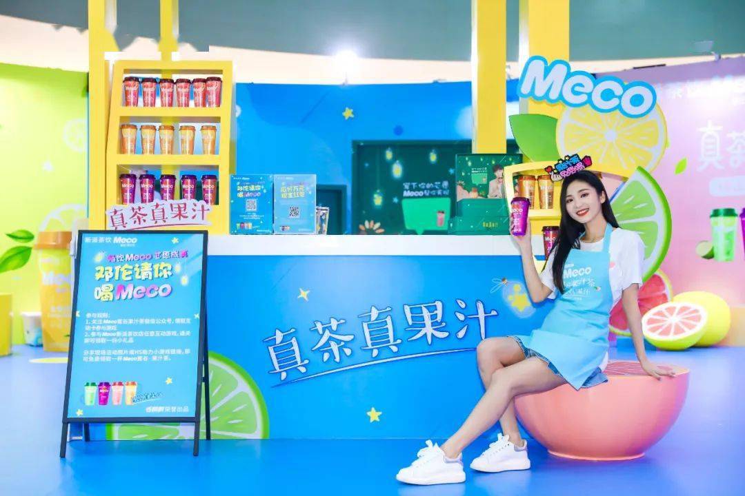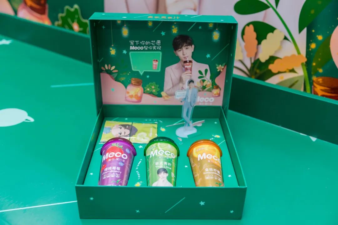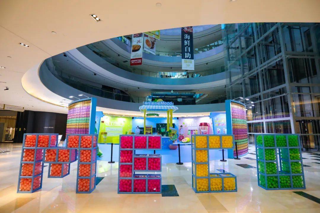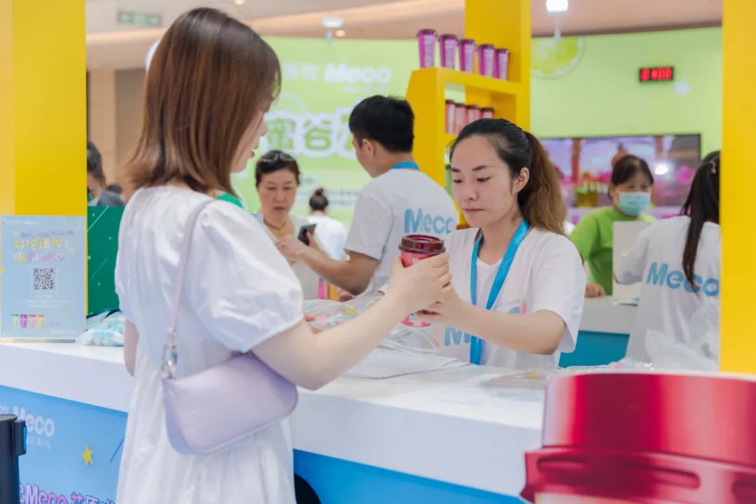 Meco快闪活动现场,许多好玩有趣的亮点让人欲罢不能,整整一万杯果汁茶打造出来的快闪店,光是看外表就气势恢宏,绝对是一个很值得打卡的地方。快闪店入场处,四色海洋球定制的Meco立体字,每个字母都代表了果汁茶的一种经典口味,也太有创意了吧!快闪店背面还有一座芯愿主题墙,脱单成功、颜值爆表、瘦成一道光,满满的的少女心呀!