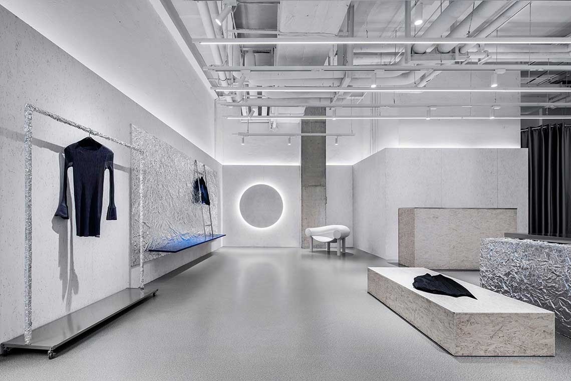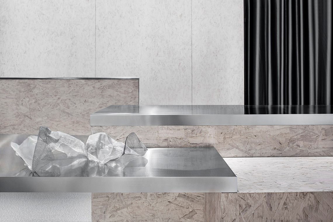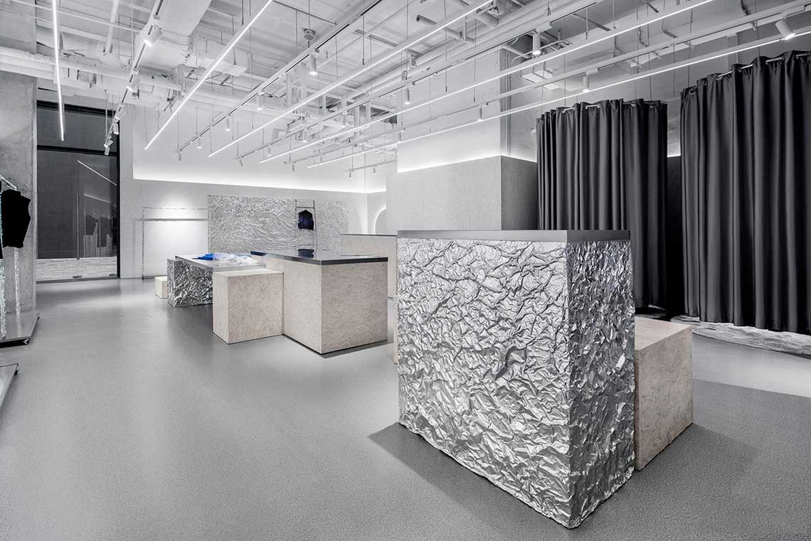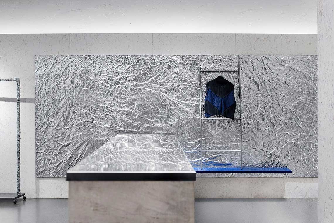 锡纸被揉皱后又铺展开,人为制造出随机的肌理和材质本身的金属质感回应了服装面料的工艺和光泽感,又与哑光的乳白色刨花板产生对比。这些材料加强了人们对于品牌核心面料的感受,成为品牌印象的一部分。