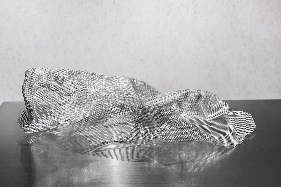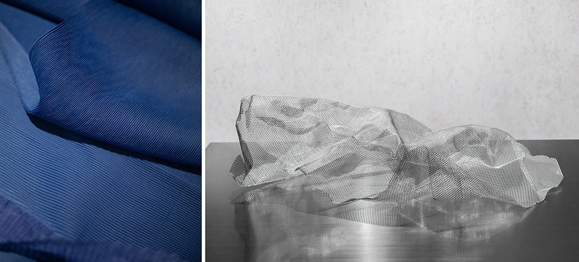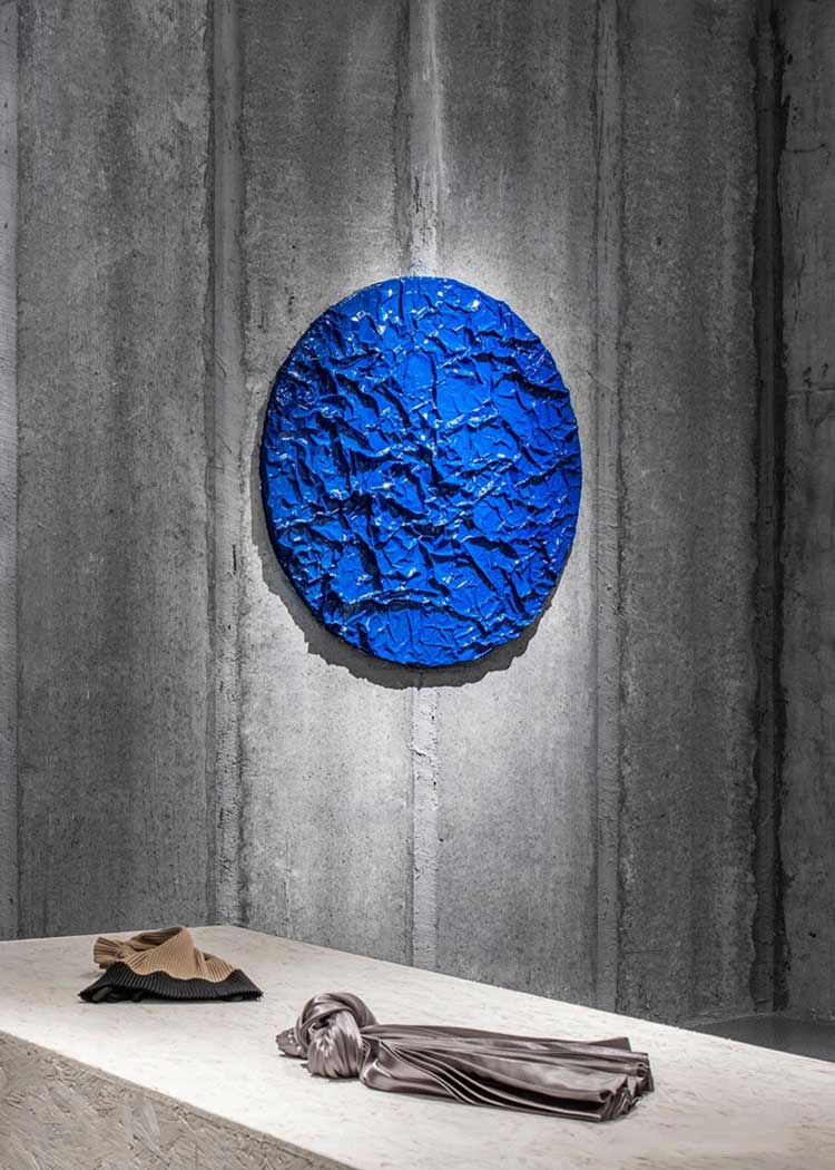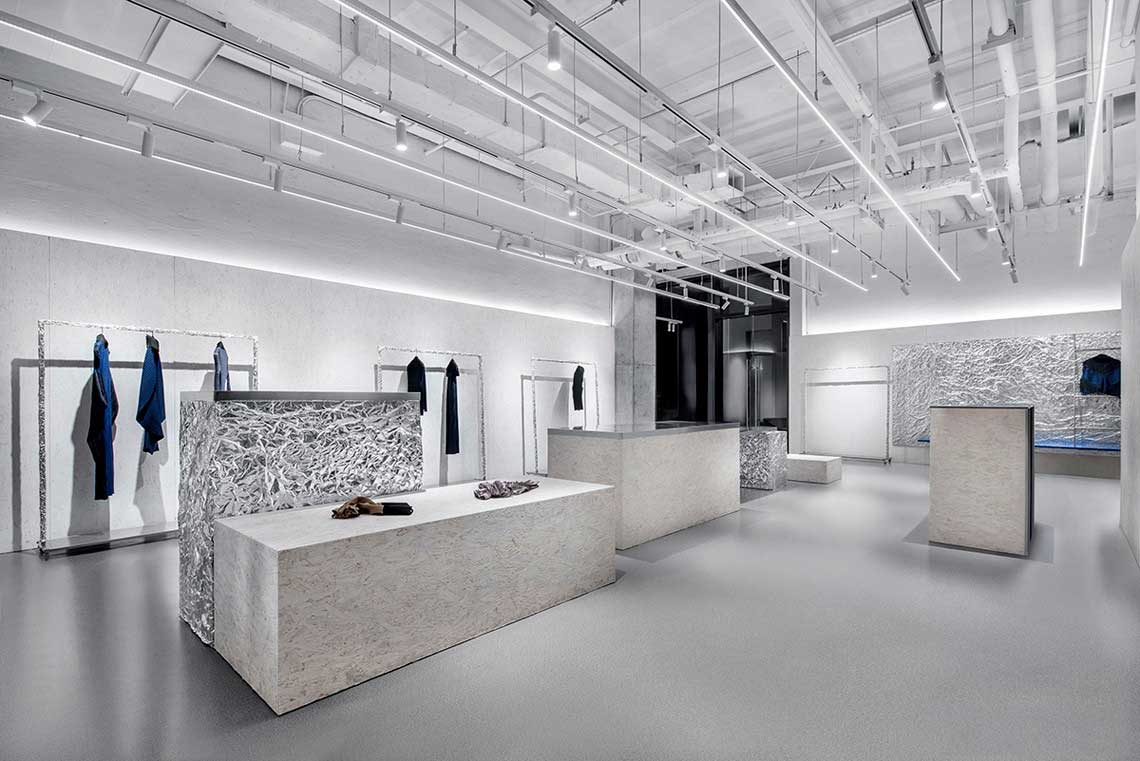 锡纸被揉皱后又铺展开,人为制造出随机的肌理和材质本身的金属质感回应了服装面料的工艺和光泽感,又与哑光的乳白色刨花板产生对比。这些材料加强了人们对于品牌核心面料的感受,成为品牌印象的一部分。