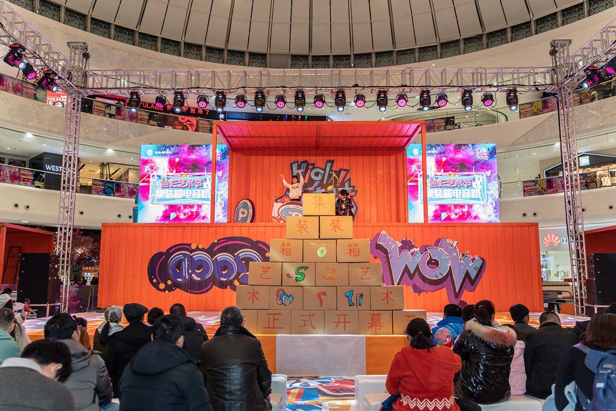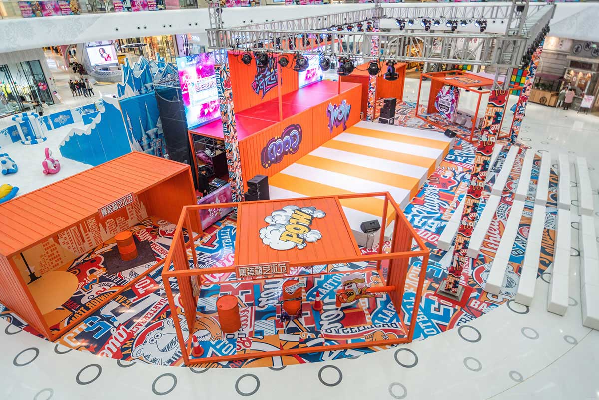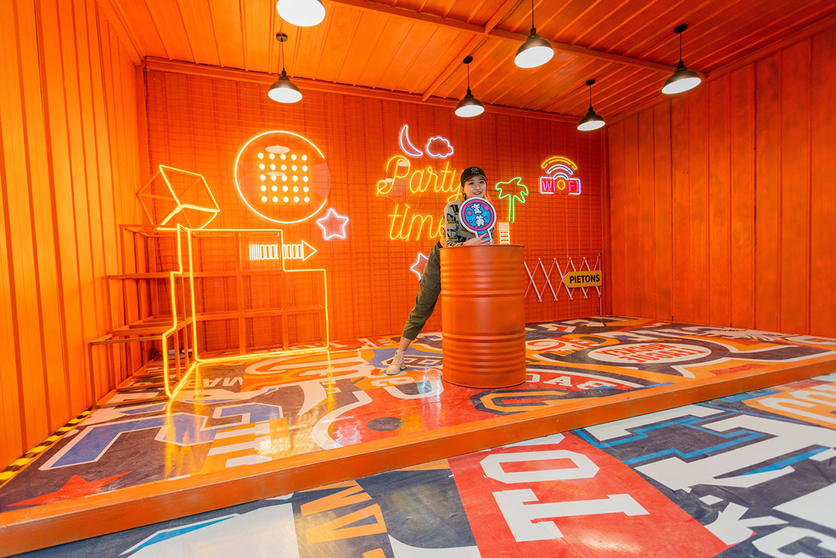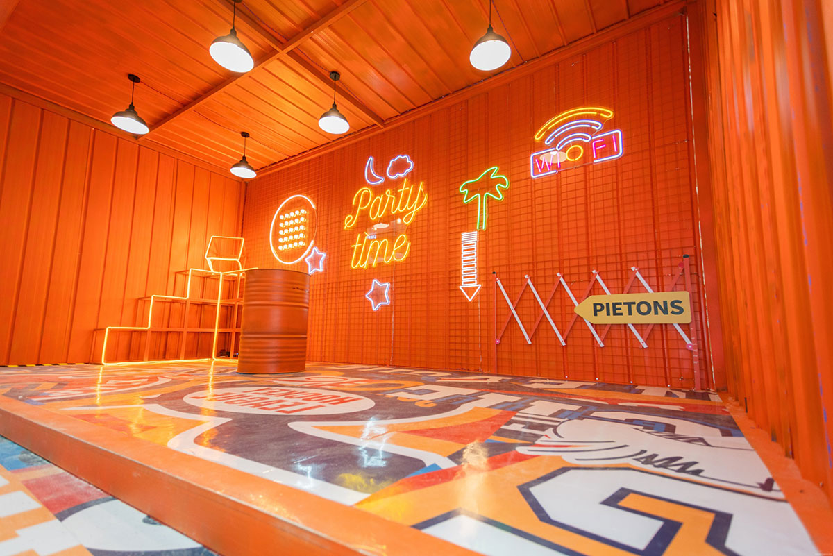 集装箱艺术节创意灵感来自生活,融创茂用硬核的集装箱配搭温暖治愈的橙黄色,融合金属的厚重与橙色的治愈打造一场色彩与空间的艺术,让艺术融入生活,让色彩与城市共振,希望每一个来到融创茂的顾客放下生活的疲惫,走进色彩艺术的世界,做个性的自己,尽情享受美好生活。集装箱艺术节,以橙黄色为主体色调,清新温暖,硬核集装箱融合街头涂鸦元素,潮味个性的涂鸦式地面更是锦上添花,打造一场潮流街头风十足的集装箱艺术节。舞台处采用堆叠方式,丰富舞台效果整体更显层次,让人眼前一新。二层与屏幕相平,增加视觉冲击的同时成就了DJ与鼓手的新秀场,开启购物中心舞台新模式,让顾客在购物中心也能感受到音乐节的视听效果。集装箱美陈打卡点,拒绝平庸,秀出个性,亮橙色的主色调搭配油漆桶、霓虹灯带、网格架,不论怎样拍都是杂志大片风。