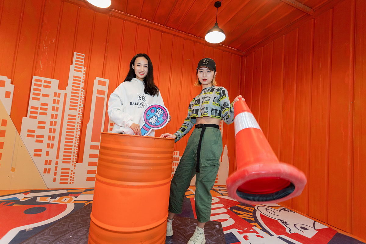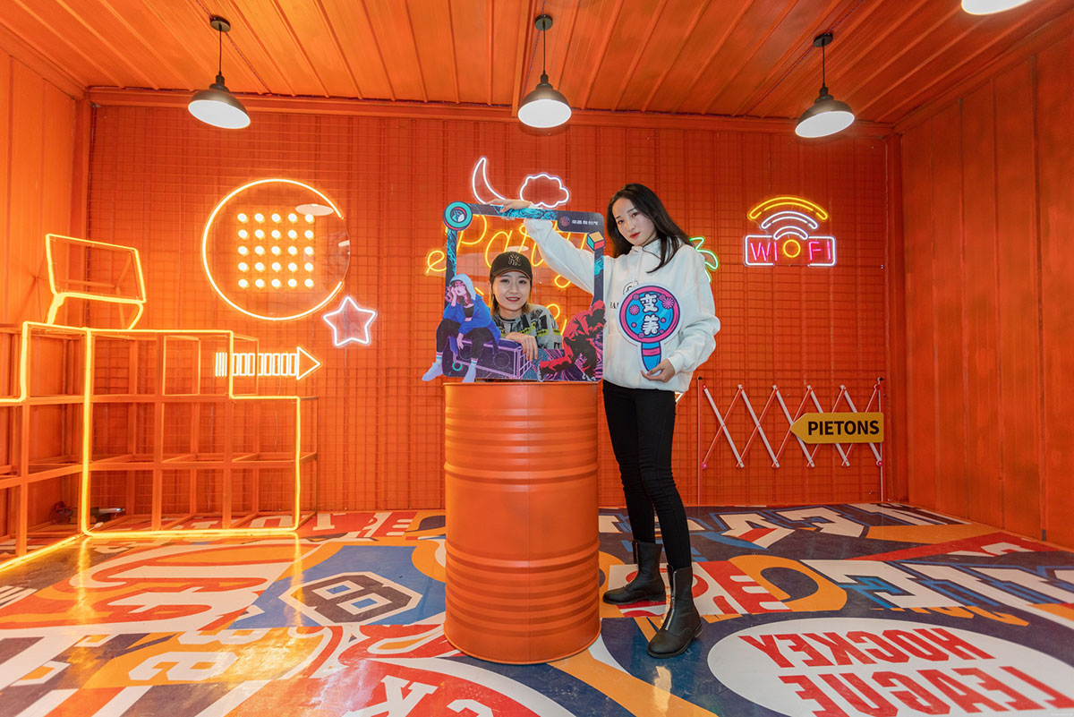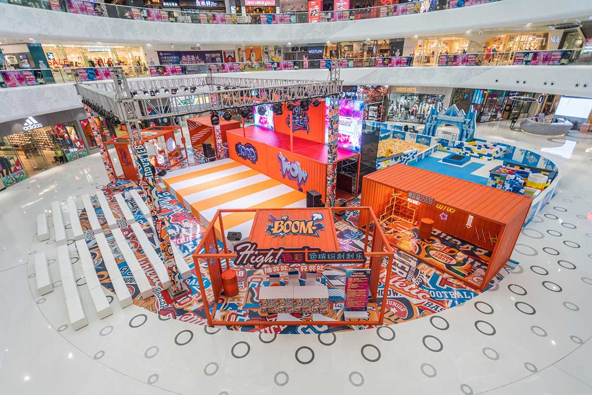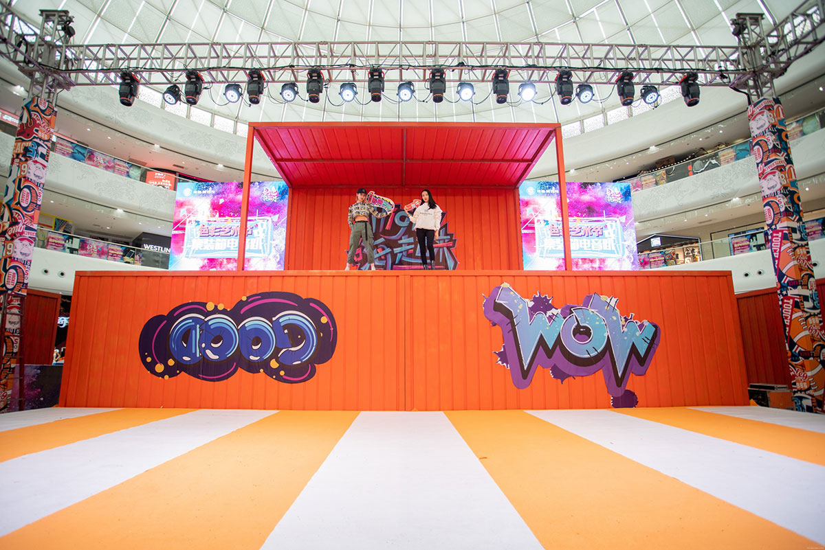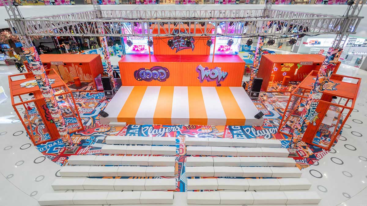 集装箱艺术节创意灵感来自生活,融创茂用硬核的集装箱配搭温暖治愈的橙黄色,融合金属的厚重与橙色的治愈打造一场色彩与空间的艺术,让艺术融入生活,让色彩与城市共振,希望每一个来到融创茂的顾客放下生活的疲惫,走进色彩艺术的世界,做个性的自己,尽情享受美好生活。集装箱艺术节,以橙黄色为主体色调,清新温暖,硬核集装箱融合街头涂鸦元素,潮味个性的涂鸦式地面更是锦上添花,打造一场潮流街头风十足的集装箱艺术节。舞台处采用堆叠方式,丰富舞台效果整体更显层次,让人眼前一新。二层与屏幕相平,增加视觉冲击的同时成就了DJ与鼓手的新秀场,开启购物中心舞台新模式,让顾客在购物中心也能感受到音乐节的视听效果。集装箱美陈打卡点,拒绝平庸,秀出个性,亮橙色的主色调搭配油漆桶、霓虹灯带、网格架,不论怎样拍都是杂志大片风。