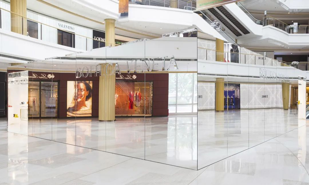 Bottega Veneta隐市之店(The Invisible Store)限时精品店于上海恒隆广场揭开帷幕,并举办2020早秋系列发布暨精品店开幕派对。隐市之店向公众展示一座反射周围环境的“隐身”装置,无需过多logo装饰自己的Bottega Veneta所彰显的是敏锐与自信的价值观。超脱了物理限制的概念,传递出Bottega Veneta的品牌真谛:自我、感性、愉悦。