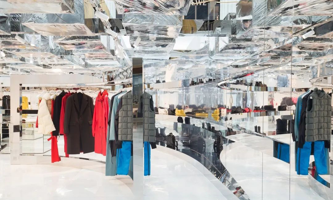 放眼隐市之店内部,反光表面利用光线与空间营造出独特的错觉效果。限时精品店占地超过100平方米,展示包括男女装成衣、手袋、小皮具、鞋履、珠宝首饰以及眼镜在内的2020早秋系列精品。