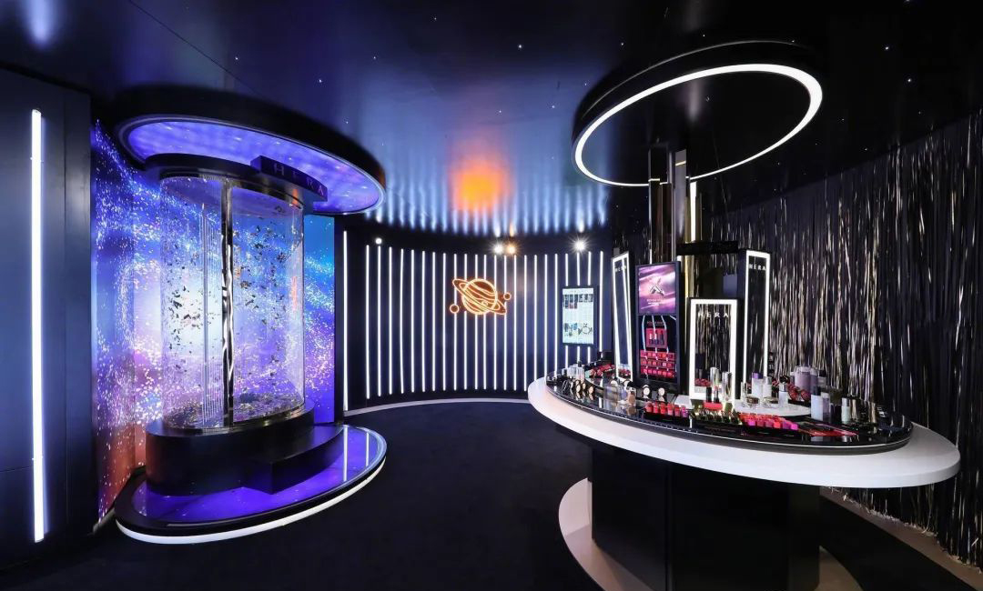 此次黑风尚星球黑闪店,借鉴了赫妍黑气垫的整体设计理念,外部造型如一个气垫,围绕着点点星光。在快闪店外侧弧形区域,如同时装周后台,明亮的化妆台上彩妆产品琳琅满目,可供消费者随心挑选打造自己妆容风格的试妆区域;进入黑闪店内,白黄转换的灯带仿若点点星光,点亮美丽星河,一个梦幻星球呈现在眼前。站上精心准备的拍照区域,脚下是金银交错的地毯,自上而下飘散开来的闪光亮片,记录下的便是“星球之旅”绝美时刻。