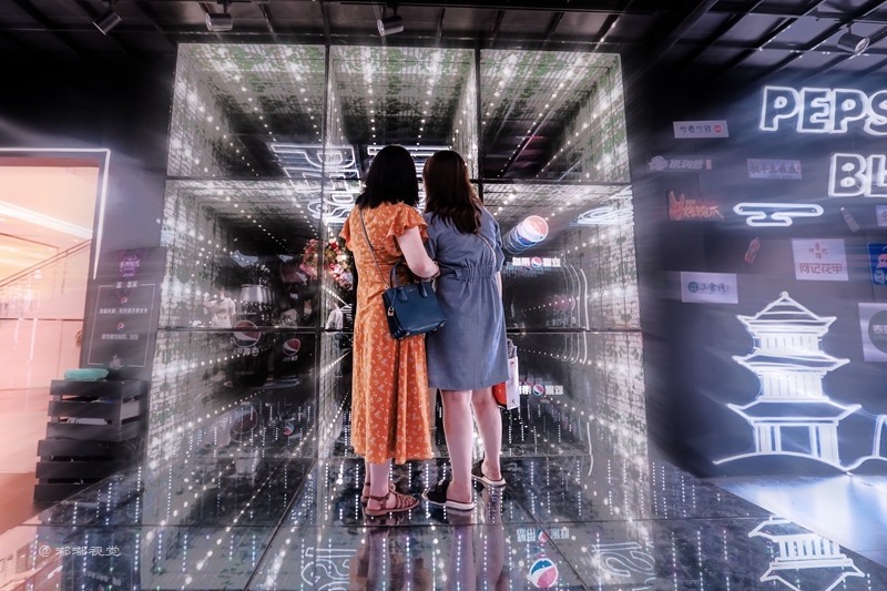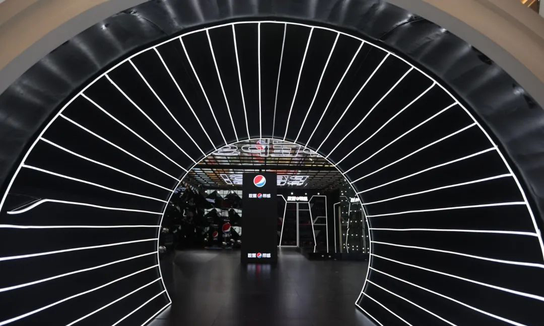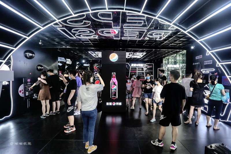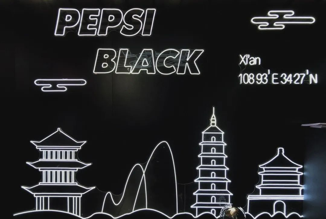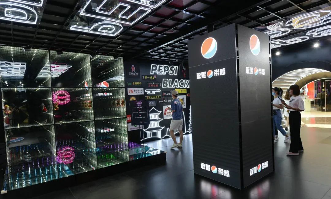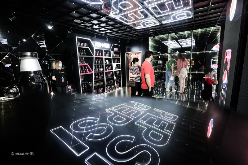 “敢黑带感”,百事潮酷“大黑盒”席卷古城,带来7大主题福利,穿越探索时光隧道,巨大的镭射可乐罐在展厅中央,你可以在魔幻棱镜前拍照打卡,全息影像呈现黑科技大酷炫,AR体验让你裸眼捕捉立体动画,3D地面给你仿佛掉入无敌黑洞,惊险刺激。
