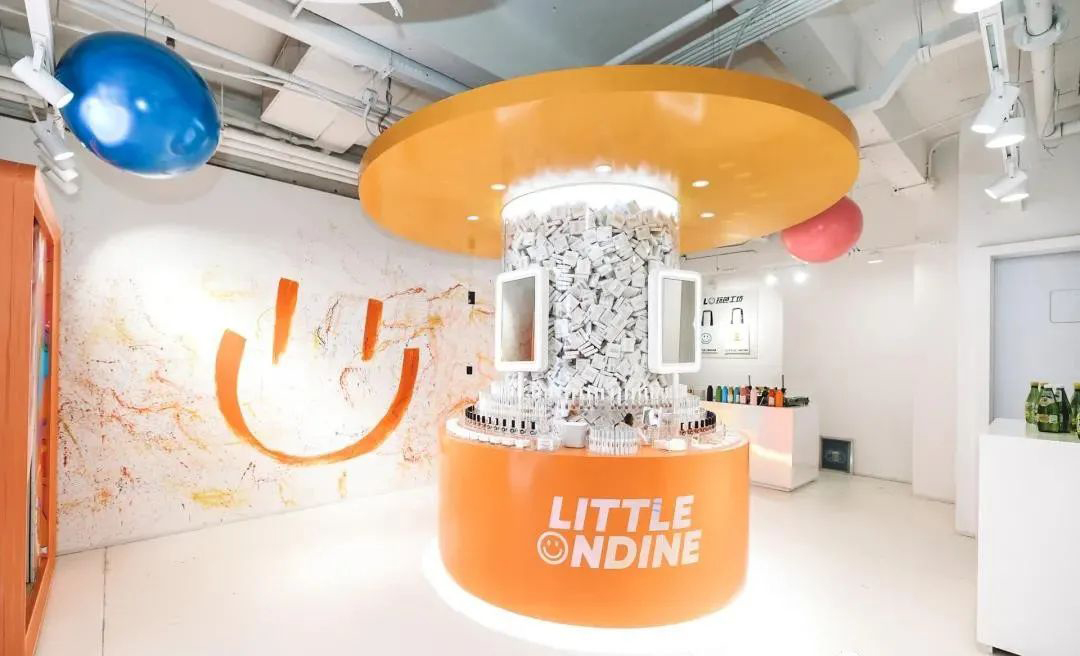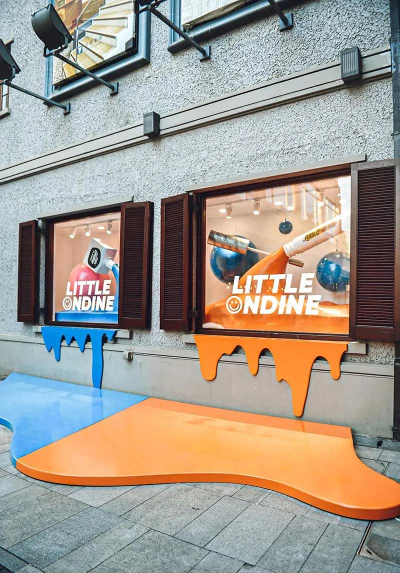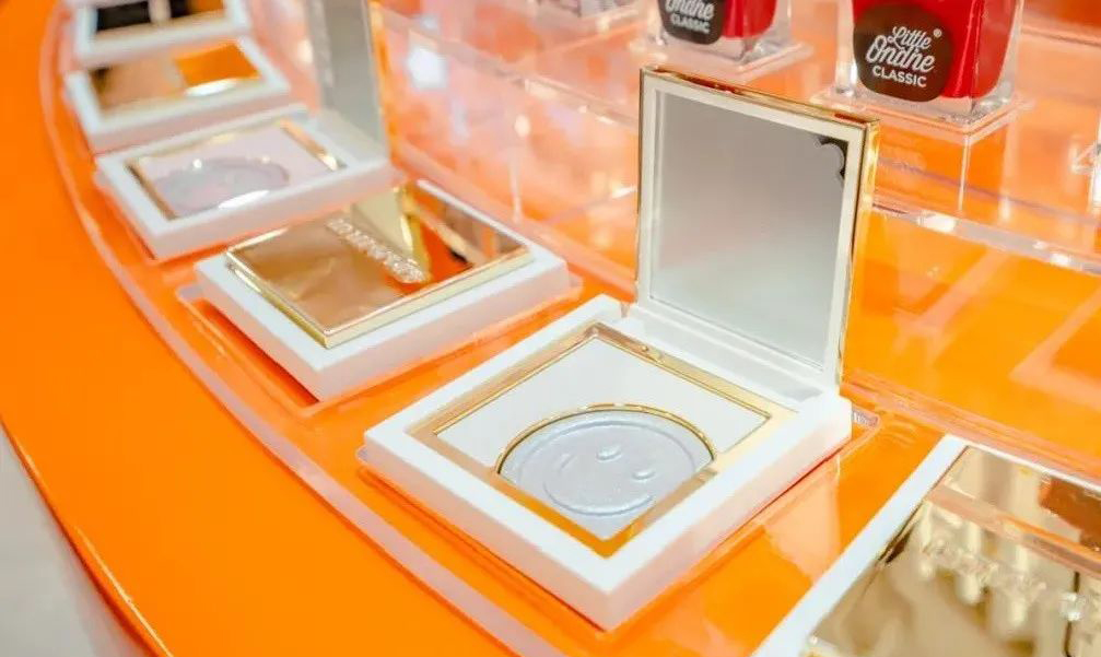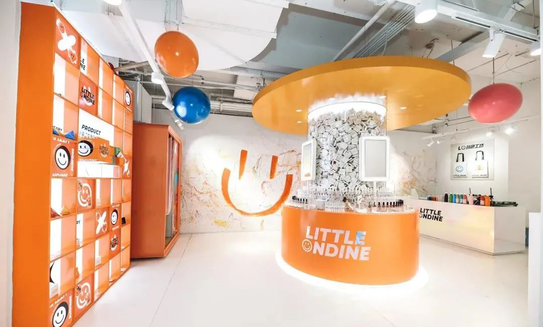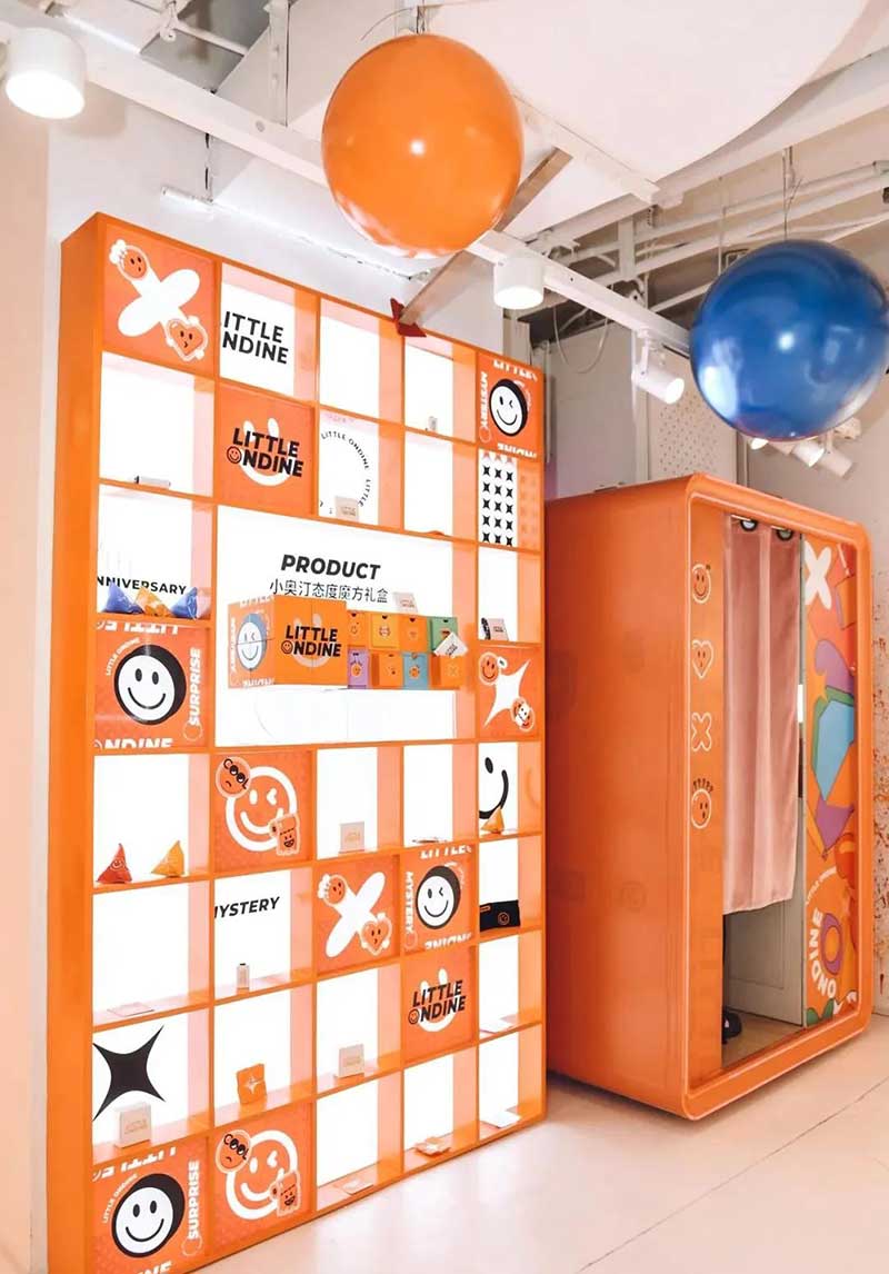 在展馆入口处,小奥汀就布置了“七脸之YOUNG”演绎墙,在原有的笑脸icon上丰富升级,演绎品牌七年来的心路历程。高饱和的蓝橙撞色,用色彩冲击你的眼球,巧妙糅合街头涂鸦风尽显年轻姿态。橱窗摆放了小奥汀指甲油和唇釉1:1放大的超级模型,视觉冲击感十足。