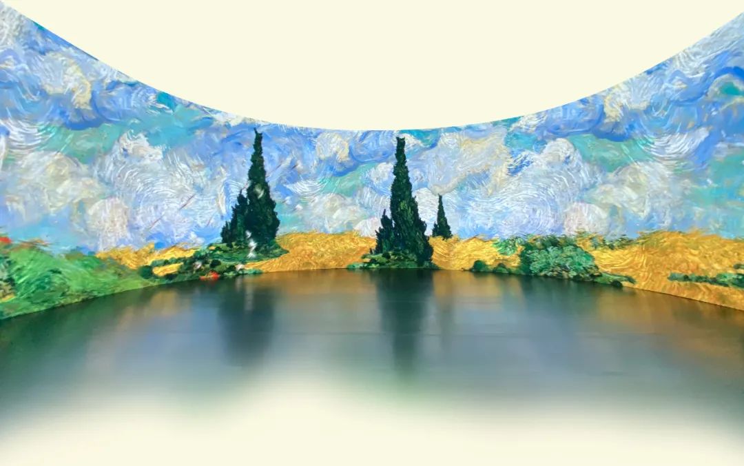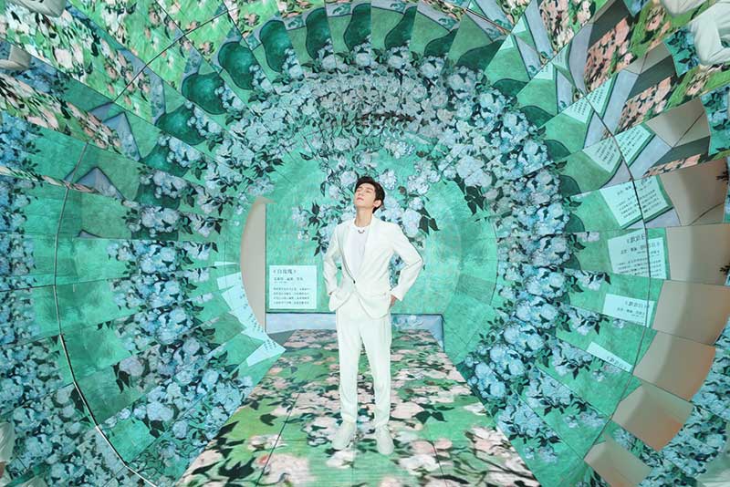 步入沉浸馆,迎面而来是精妙重现的大都会艺术博物馆外观,予人身临其境之感。在玫瑰区,梵高的名画《玫瑰》在镜面与影像变换中,幻化为“玫瑰万花筒”走廊。朴素纯洁的白玫瑰与洋溢生命活力的绿色于此流动,耳边传来风吹鸟语,让人沉浸于自然与艺术交织的融合世界。观赏者还可在棱镜立体感背景中,毫不费劲地拍出媲美杂志大片的效果。迈入古源图书馆,观展者可领略印象派大师莫奈杰作《鲁昂大教堂》光影之美,捕捉住在阳光照耀下,古老教堂墙面在一瞬间给人带来的灿烂印象。在想象中步入名画中的大教堂,来到一间静谧的图书馆,翻阅古人留下的古法美颜智慧。移步红茶区,将能欣赏大都会博物馆镇馆名作,印象派大师梵高的《麦田与柏树》。现场借助大型环形多媒体互动屏幕,精妙捕捉摇曳的麦田、柏树之姿,并突出自然中最具表现力的场景——蓝天和白云,借此诠释出无限的生命力和源源希望,尽展“博物馆里的大自然”,是新艺术形态的极佳呈现。同时,通过AR立体拍摄,观赏者仿佛置身于梵高名画之中,与艺术融为一体。
