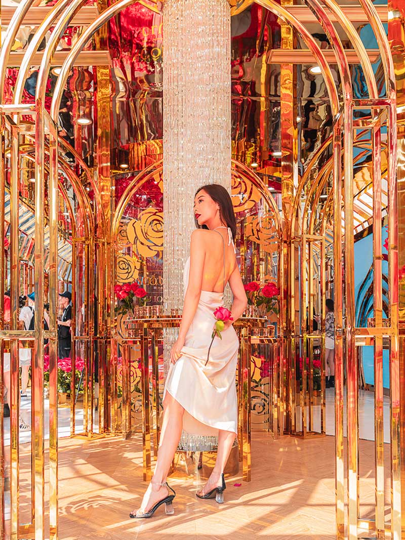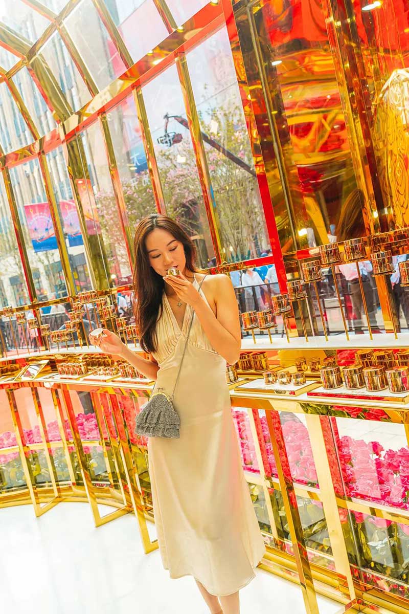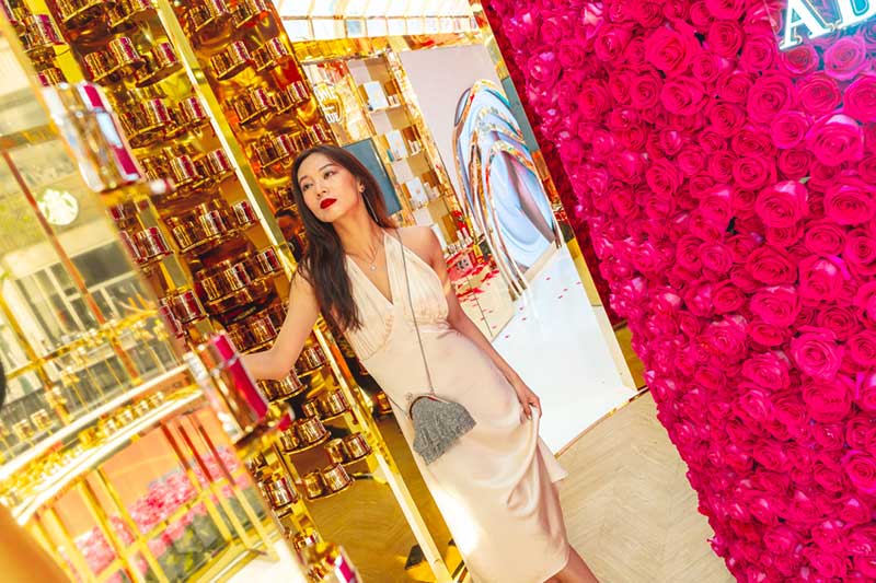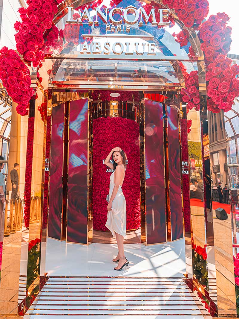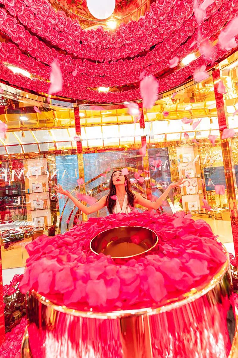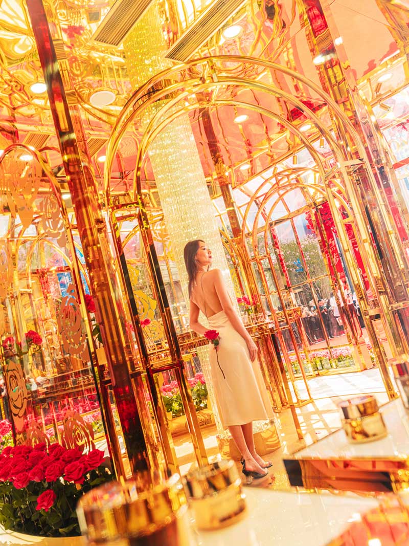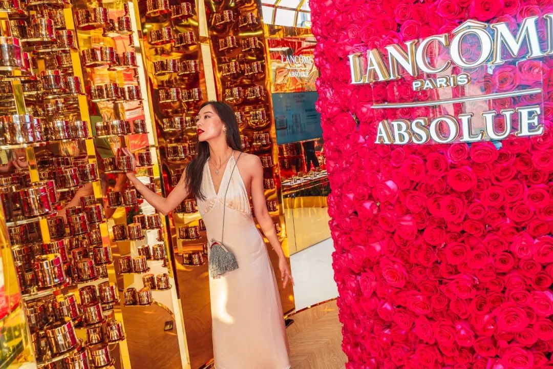 从花坊左侧大门进来,便来到了由高级进口玫瑰搭建而成的浪漫花园。走进其中,芳香肆溢出的玫瑰芳香已经扑面而来,在城市中央也能悦享芬芳!360°沉浸式新鲜玫瑰围绕,娇艳欲滴的高级进口玫瑰萦绕在金色的墙面上,还有一个玫瑰花柱,让你身临其境地沉醉在兰蔻的玫瑰世界中,试问哪个女孩看了不心动?超唯美的花园美景,每个角落随手一拍都能轻松get法式优雅美照。想要制霸朋友圈的仙女们,拍它!